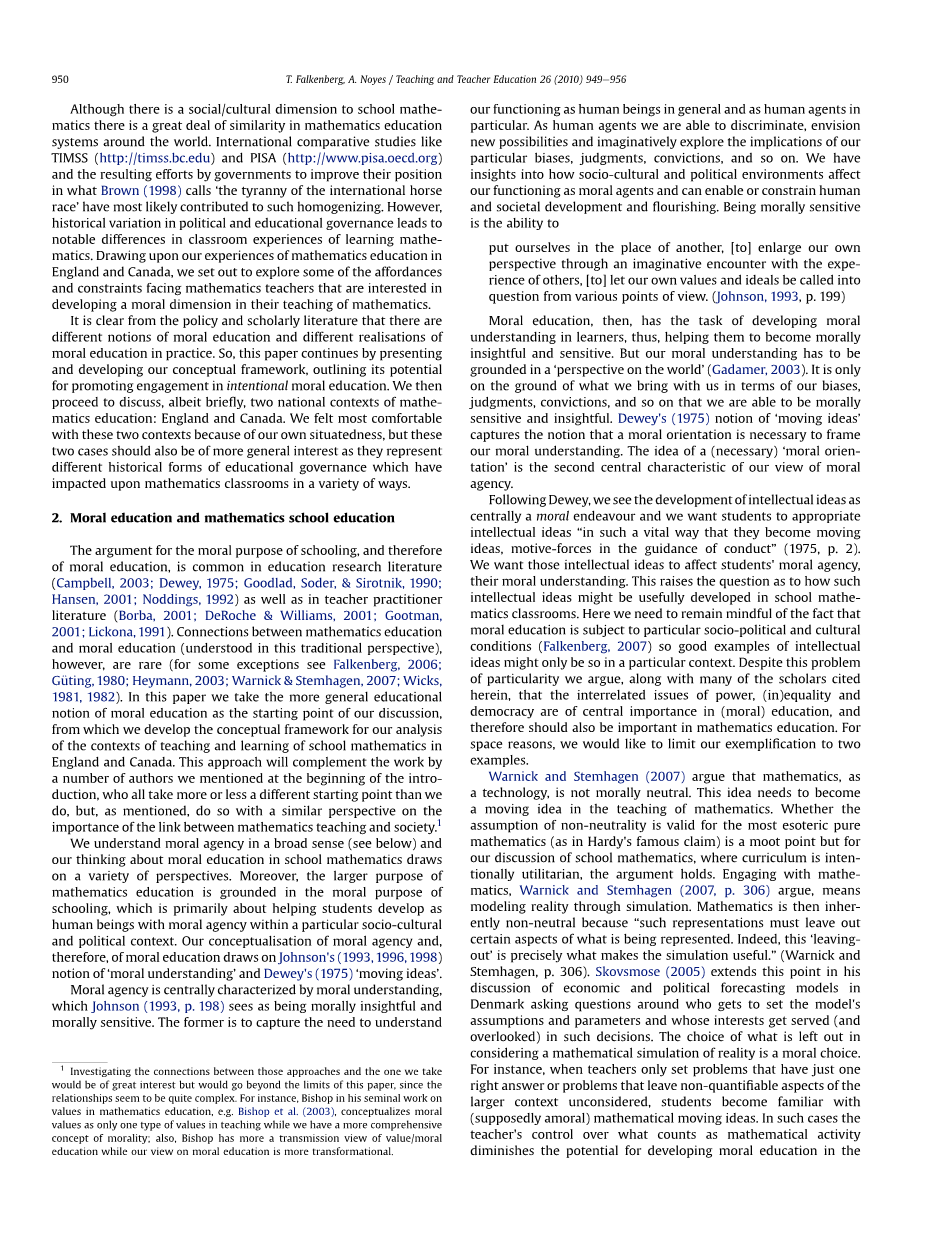 关于学校教育的道德目的以及因此产生的道德教育的争论,在教育研究文献以及教师实习文献中很常见。数学教育以及德育之间的联系(从这个传统的角度理解)很少(对于一些例外情况)。本文我们以更为普遍的德育概念作为讨论的出发点,为我们分析英格兰和加拿大的学校数学教学环境建立了概念框架。这种方法会补充我们在开始介绍时提到的一些作者的工作,他们的出发点与我们有或多或少的不同,但是正如前面提到的,他们对数学教学与社会之间的联系的重要性持相似的观点。