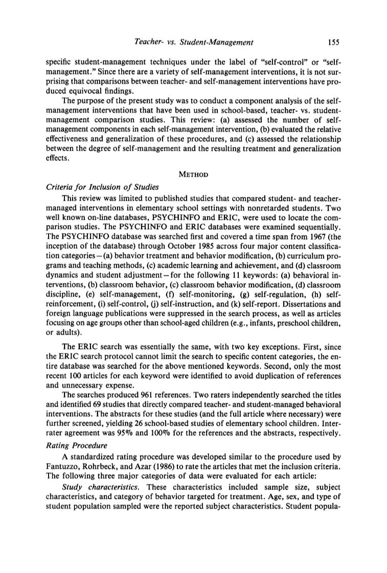 先前对这些方法与儿童进行比较的研究的总体概述似乎表明,这两种儿童治疗方法的有效性没有明确或一致的差异。一些研究人员报告说,教师和学生管理的干预措施同样有效(例如,费利克斯布罗德和奥利里,1973 年,1974 年;以色列,以色列,普拉夫德,1981 年)。其他人报告了不同的结果(例如,比林斯利,1977;布劳内尔、科莱蒂,埃尔斯纳-赫施菲尔德,赫施菲尔德和威尔逊,1977),而还有一些人报告说, 学生管理的干预优于教师管理的干预(例如,鲍尔斯、克莱门特、范图佐和索伦森, 1985;公爵,1982;埃德加和克莱门特,1980)。然而,所有这些比较都是有缺陷的, 因为它们未能解释自我管理干预措施中的主要差异。