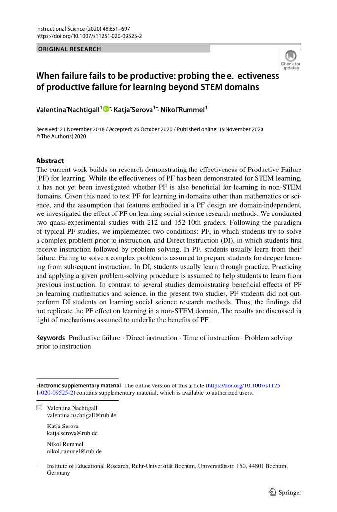 现有的实践是建立在有效失败(PF)对学习有效性的基础上的。虽然PF在STEM学习中的有效性已经得到证实,但它是否对非STEM领域的学习也有效还没有得到研究。考虑到测试PF在数学或科学以外的领域的学习,并且假设PF设计中体现的特征与领域无关,我们研究了PF对学习社会科学研究方法的影响。我们对212名和152名10年级学生进行了两项准实验研究。遵循典型的PF研究范式,我们设计了两个条件:PF,即学生在接受指导之前试图解决一个复杂的问题;以及直接指导(DI),即学生首先接受指导,然后解决问题。在PF中,学生通常会从失败中学习。假设未能 解决一个复杂的问题是为了让学生准备好从后续的教学中进行更深入的学习。在DI中,学生通常通过实践来学习。实践和应用给定的问题解决程序被认为有助于学生从以前的教学中学习。与证明PF对学习数学和科学有益的几项研究相比,在目前的两项研究中,PF学生在学习社会科学研究方法方面并没有胜过DI学生。因此,研究结果没有复制PF对非STEM领域学习的影响。这些结果是根据PF益处的潜在机制进行讨论的。