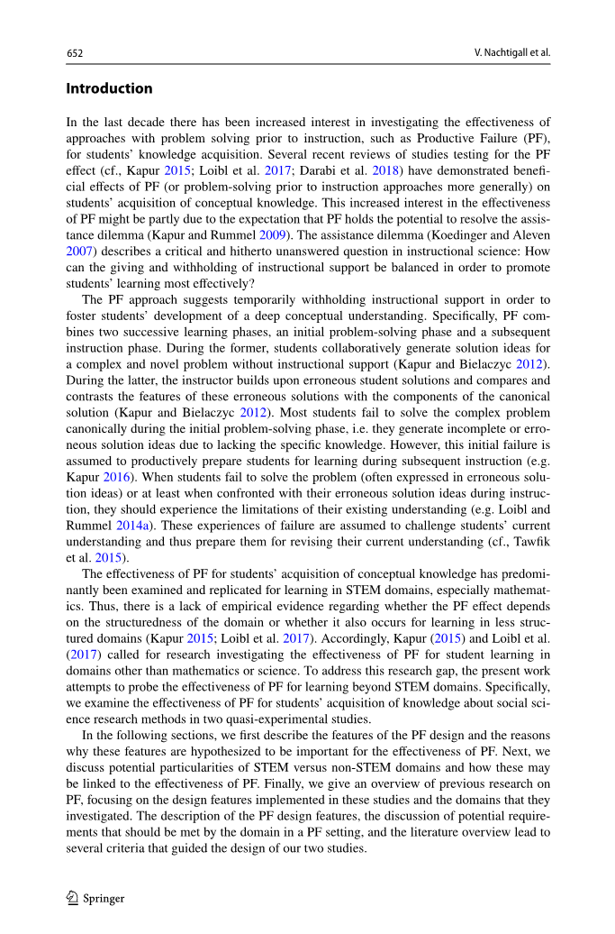 在过去的十年中,人们越来越关注调查在教学之前解决问题的方法的有效性,例如生产性失败(PF),以促进学 生的知识获取。最近对PF效应测试研究的几项评论(参见 Kapur 2015;Loibl等人2017;Darabi 等人 2018)证明了PF(或更普遍地在教学方法之前解决问题)对学生的有益影响获得概念性知识。这种对PF有效性的兴趣增加的部分原因可能是预期PF 具有解决援助困境的潜力(Kapur 和 Rummel 2009)。援助困境(Koedinger和Aleven 2007)描述了教学科学中一个关键且迄今未解决的问题:如何平衡教学支持的给予和拒绝,以最有效地促进学生的学习?