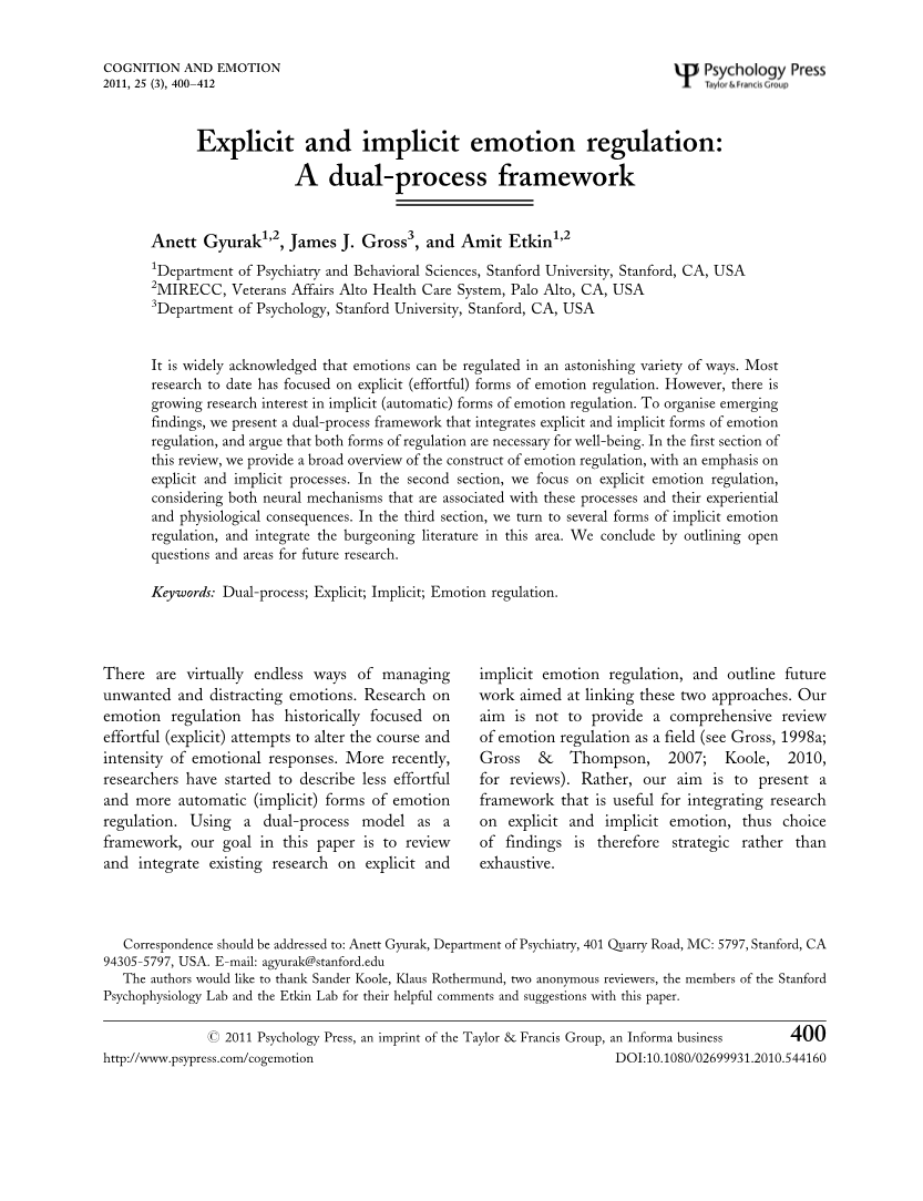 事实上,有无数种方法可以管理不需要的和分散注意力的情绪。关于情绪调节的研究历来聚焦于努力(外显的)改变情绪反应的过程和强度。最近,研究人员已经开始描述更轻松、更自动(内隐的)的情绪调节形式。使用一个双过程模型作为框架,我们的目标是在这篇论文中回顾和整合现有的研究外显和内隐情绪调节,并概述了旨在连接这两种方法的未来工作。我们的目的不是提供一个情绪调节领域的综述。相反,我们的目的是提出一个有助于整合外显和内隐情绪研究的框架,因此研究结果的选择是战略性的,而不是穷尽性的。
