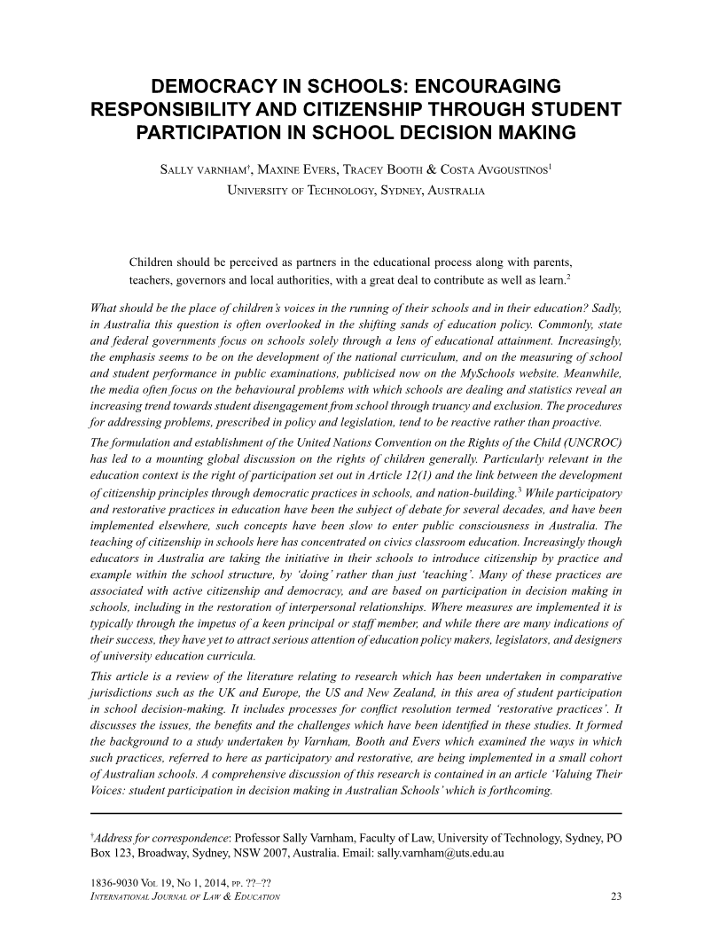 《联合国儿童权利公约》的制定和确立,导致关于儿童权利的全球讨论日益增多。在教育方面特别相关的是第12条第1款规定的参与权,以及通过学校的民主做法发展公民权原则与国家建设之间的联系。如何在教育背景下实现参与权?孩子们的声音在他们的学校管理中应该处于什么位置?可悲的是,在澳大利亚,这个问题常常被忽视,因为教育政策在很大程度上是由政治和经济的需要引导的。通常,州政府和联邦政府只是从教育程度和国家课程的发展以及学校和学生成绩的衡量的角度来关注学校。与此同时,媒体往往关注学校正在处理的行为问题,统计数据显示,学生越来越多地通过逃学和被开除而离开学校。政策和立法规定的解决问题的程序往往是被动的,而不是主动的。