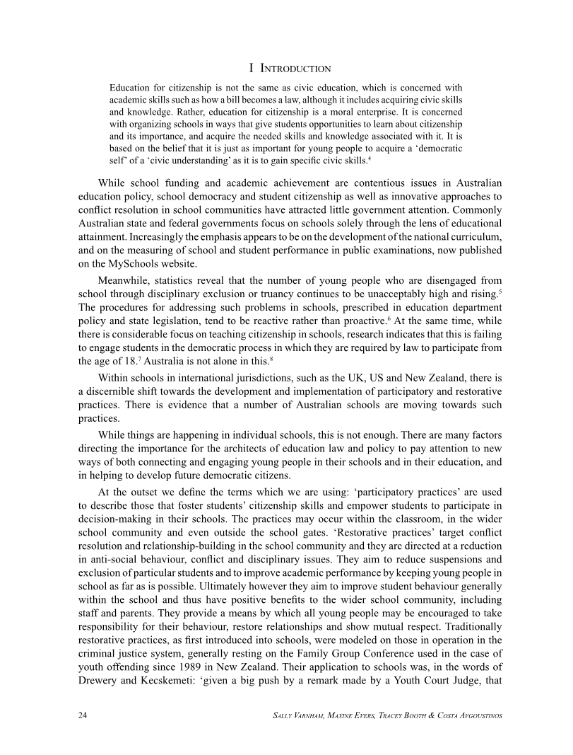以作出很大贡献,也可以学到很多东西。[1]儿童的声音在学校的管理和教育中应该处于什么地位?不幸的是,在澳大利亚,这个问题在教育政策的流沙中经常被忽视。通常,州政府和联邦政府只是从学历的角度来关注学校。越来越多的重点似乎是制定国家课程,以及衡量学校和学生在公开考试中的表现,现在已在MySchools网站上公布。与此同时,媒体往往关注学校正在处理的行为问题,统计数据显示,学生越来越多地通过逃学和被开除而离开学校。政策和立法规定的解决问题的程序往往是被动的,而不是主动的。《联合国儿童权利公约》的制定和确立,导致关于儿童权利的全球讨论日益普遍。在教育方面特别相关的是第12条第1款规定的参与权,以及通过学校的民主做法发展公民权原则与国家建设之间的联系。[2]虽然参与性和恢复性教育做法几十年来一直是辩论的主题,并在其他地方得到实施,但这些概念在澳大利亚进入公众意识方面进展缓慢。这里学校的公民教育集中在公民课堂教育上。尽管澳大利亚的教育工作者越来越多地在他们的学校采取主动,在学校结构中通过实践和榜样,通过”实践”而不仅仅是”教学”来引入公民权。其中许多做法与活跃公民和民主有关,并以参与学校决策为基础,包括参与恢复人际关系。这些措施的实施通常是在热心的校长或工作人员的推动下进行的,虽然有许多迹象表明这些措施取得了成功,但尚未引起教育政策制定者、立法者和大学教育课程设计者的认真关注。本文回顾了英国、欧洲、美国和新西兰等比较司法管辖区在学生参与学校决策方面所进行的研究。它包括称为“恢复性实践”的冲突解决过程。它讨论了在这些研究中发现的问题,好处和挑战。它构成了Varnham、Booth和Evers进行的一项研究的背景,这项研究审查了在一小批澳大利亚学校中实施这种做法的方式,这里称之为参与性和恢复性做法。这项研究的全面讨论包含在一篇即将发表的文章“珍视他们的声音: 学生参与澳大利亚学校的决策”中。