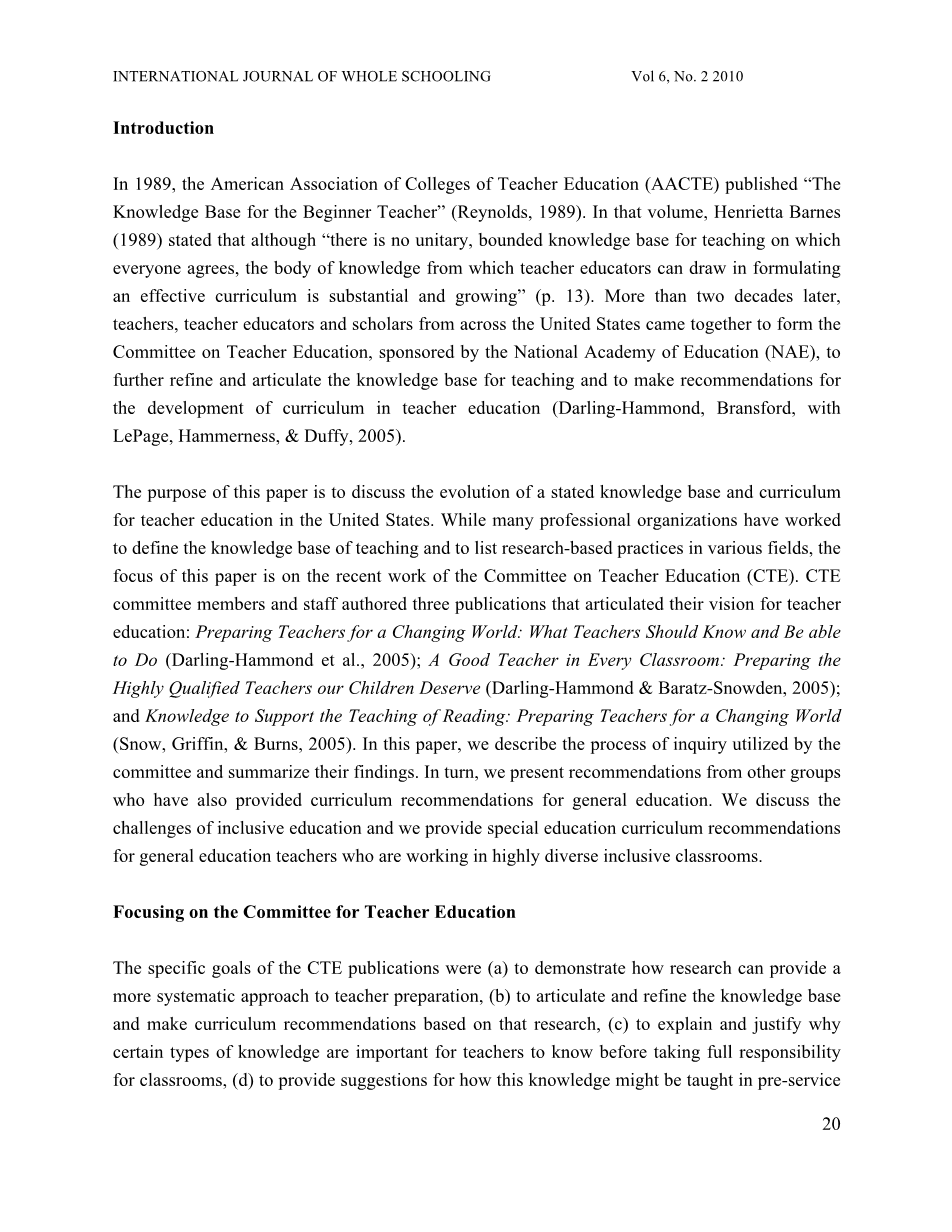 本文的目的是讨论美国教师教育知识库和课程体系的演变。虽然许多专业组织努力定义教学知识库,并列出各个领域基于研究的实践,但本文的重点是教师教育委员会(CTE)最近的工作。CTE委员会成员和工作人员撰写了三份出版物,阐述了他们对教师教育的愿景:《让教师为不断变化的世界做好准备:教师应该知道什么和能够做什么》(Darling-Hammond等人,2005年);《每个教室里的好老师:为我们孩子培育高素质的教师》(达林-哈蒙德amp;巴拉茨-斯诺登,2005);和《支持阅读教学的知识:让教师为变化的世界做好准备》(斯诺,格里芬,彭斯,2005)。在本文中,我们描述了委员会使用的调查过程,并总结了他们的调查结果。接下来,我们提出了其他团体的建议,这些团体也为普通教育提供了课程建议。我们讨论全纳教育面临的挑战,并为在高度多元化的全纳教室工作的普通教育教师提供特殊教育课程建议。