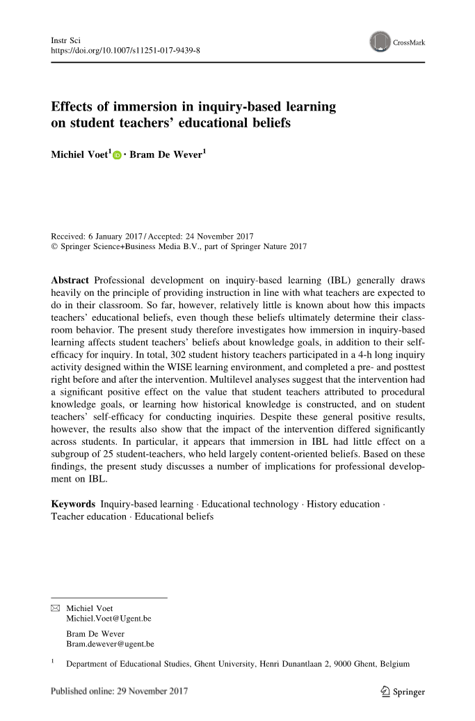 这一实际难题的可能解决方案可能在于使用教育技术,特别是因为一些研究人员认为,在历史教育的背景下,技术的主要资产之一是其支持IBL活动的能力(Copeland1985;Voet和DeWever2017b)。特别是,技术提供了创建多媒体的可能性,这些多媒体可以采取调查工具、记录保存工具或知识源的形式(Edelsonetal.1999)。通过这种方式,技术工具可以帮助设计真实的查询,创建强大的可视化,支持学习者之间的协作,并促进自主和元认知学习实践(Donnellyetal.2014)。因此,人们对使用技术支持IBL产生了相当大的兴趣(参见Linn等人2013年;vanJoolingen和Zacharia2009年),一些人认为技术也可能增强对IBL的兴趣和动力(Blumenfeld等人。1991),或者换句话说,积极影响教师对IBL的信念。