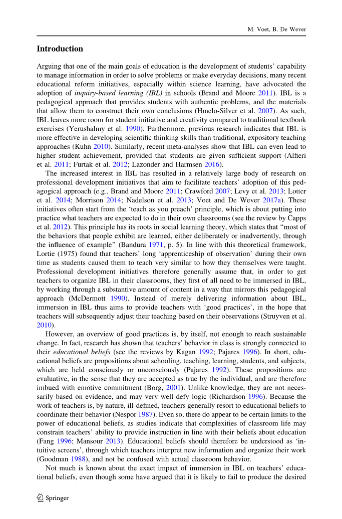 对IBL兴趣的增加导致了对旨在促进教师采用这种教学方法的专业发展计划的相对大量研究(例如,Brand和Moore2011;Crawford2007;Levy等人2013;Lotter等人。2014;Morrison2014;Nadelson等人2013;Voet和DeWever2017a)。这些举措通常从“说教就教”原则开始,该原则是将教师在自己的课堂上应该做的事情付诸实践(参见Capps等人2012年的评论))。这一原则源于社会学习理论,该理论指出“人们表现出的大多数行为都是通过榜样的影响有意或无意地学习的”(Bandura1971,第5页)。根据这一理论框架,Lortie(1975)发现,教师在学生时期的长期“观察学徒期”使他们的教学方式与他们自己的教学方式非常相似。因此,专业发展计划通常假设,为了让教师在课堂上组织IBL,他们首先需要沉浸在IBL中,通过以反映这种教学方法的方式处理大量内容(McDermott1990)。因此,沉浸在IBL中不仅仅是提供有关IBL的信息,而是旨在为教师提供“良好实践”,希望教师随后根据他们的观察调整他们的教学(Struyven等人,2010年)。