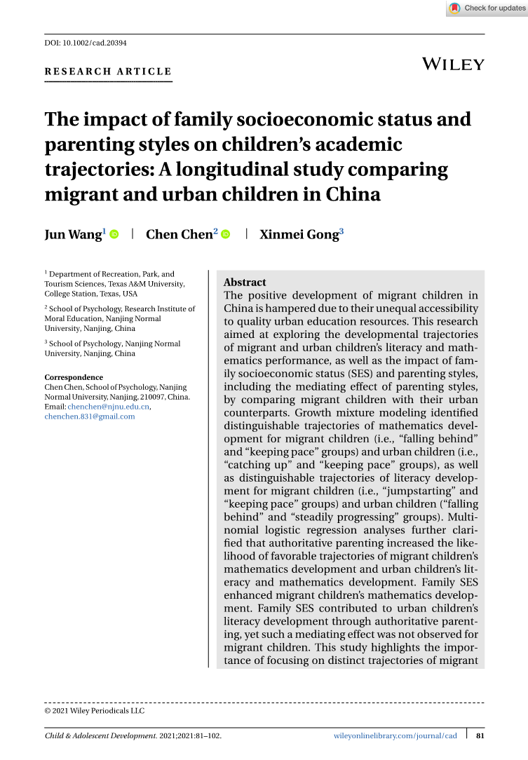 家庭社会经济地位和父母教养方式对儿童学业轨迹的影响:一项比较中国流动儿童和城市儿童的纵向研究外文翻译资料