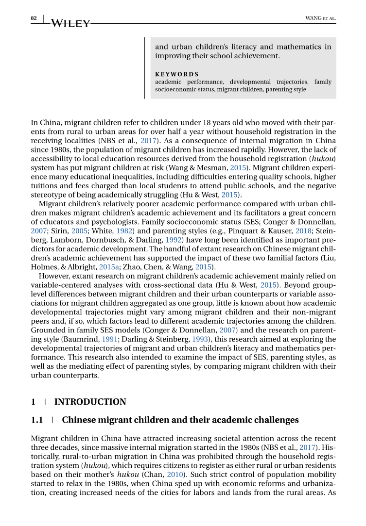 流动儿童的学业成绩较城市儿童相对较差,这使得流动儿童的学业成绩及其促进因素备受教育者和心理学家的关注。家庭社会经济地位(SES;Conger amp; Donnellan, 2007;Sirin, 2005;怀特,1982年)和育儿风格(例如,Pinquart amp; Kauser, 2018年;Steinberg, Lamborn, Dornbusch, amp; Darling, 1992)一直被认为是学术发展的重要预测因素。现有的少数关于中国流动儿童学业成就的研究支持了这两个家庭因素的影响(Liu, Holmes, amp; Albright, 2015a;赵,陈,王,2015)。