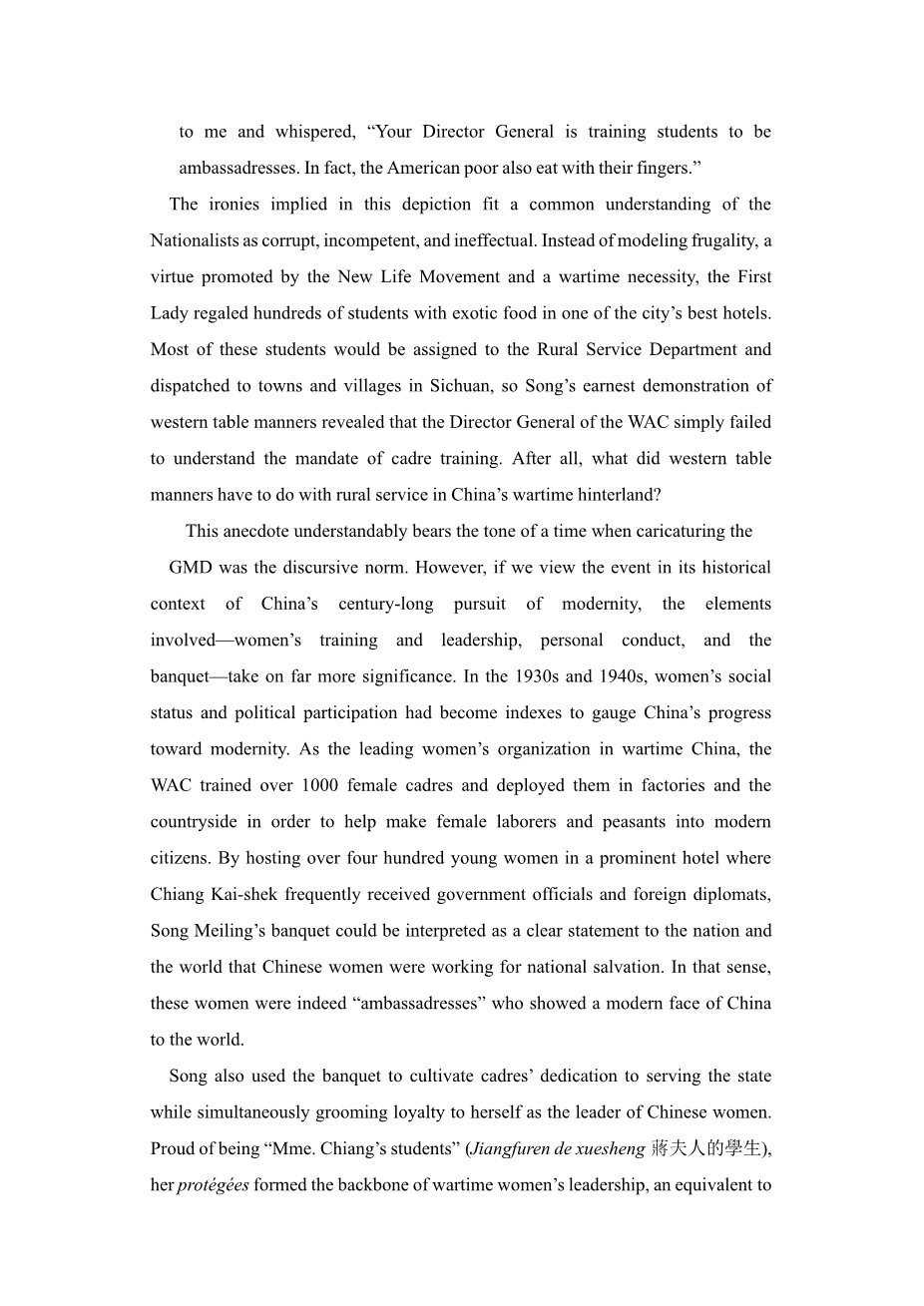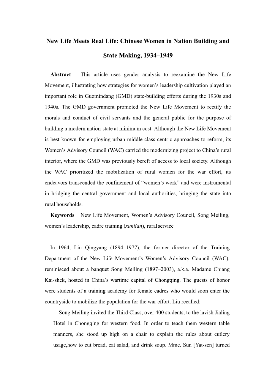 新生活与现实生活:国家建设与民族塑造中的中国女性(1934-1949)外文翻译资料