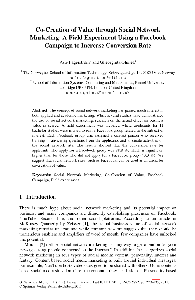 社交网络营销的概念在应用营销和学术营销中都引起了广泛的兴趣。虽然有几项研究已经证明了社交网络营销的使用,但是关于其对企业价值的实际影响的研究却很少。他们准备了一个实地实验,邀请申请IT学士学位的人加入一个与感兴趣的主题相关的Facebook小组。每个Facebook小组都分配了一个联系人,此人接受了回答申请人问题和在社交网站上创建活动的培训。结果显示,申请Facebook群组的转化率为88.8%,显著高于未申请Facebook群组的转化率(43.3%)。我们建议像Facebook这样的社交网站可以作为共同创造价值的场所。