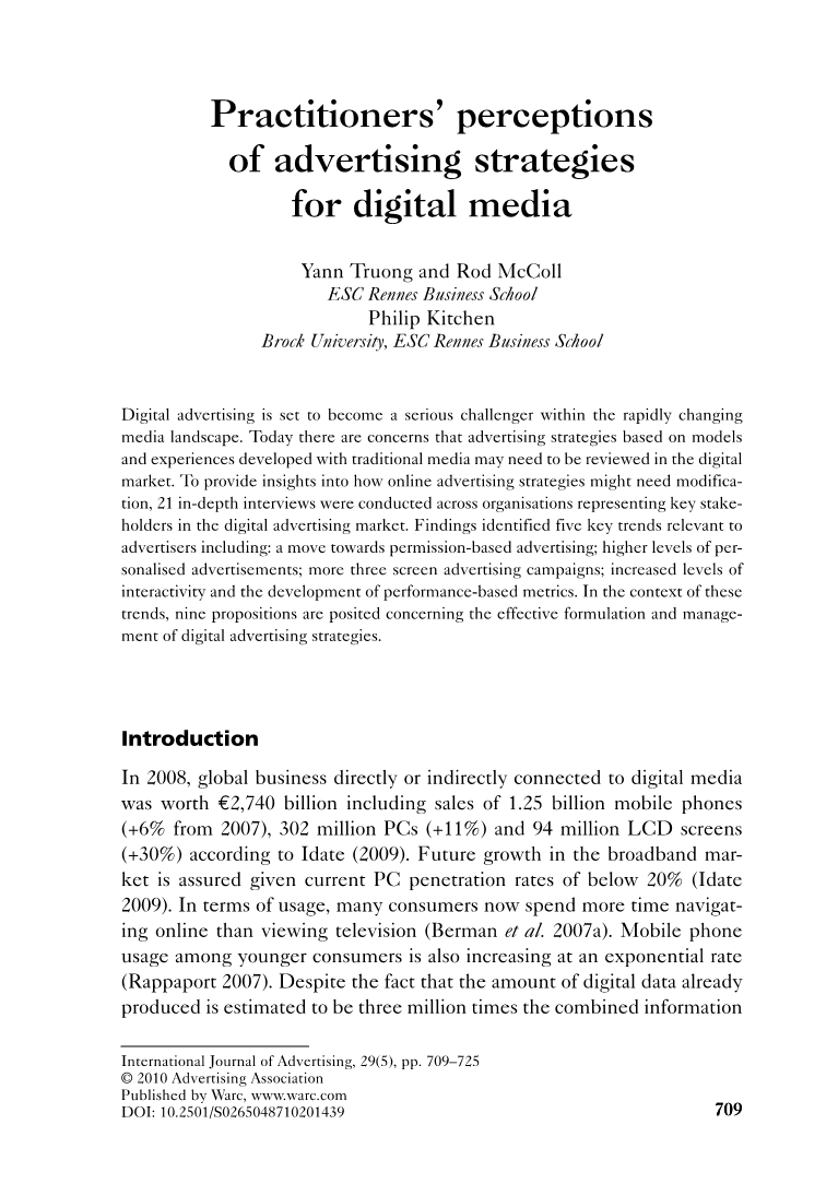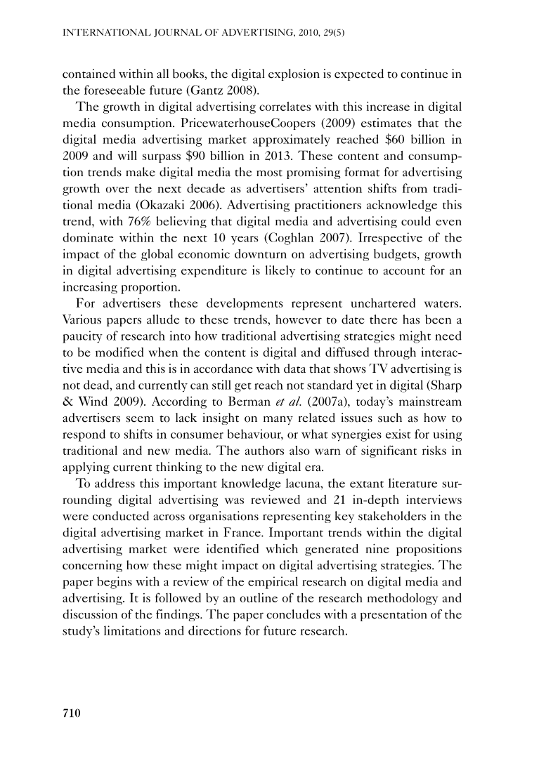 为了解决这个重要的知识空白,本文围绕数字广告对现存文献进行了查阅,并对21个在法国数字广告市场能够代表关键利益的组织机构的相关人员进行深入访谈。数字广告市场的重要趋势由此被确定,并在此基础上提出了关于这些趋势如何作用于数字广告策略的九个主张。本文首先回顾了数字媒体和广告的实证研究,其次是概述研究方法和研究结果,最后结尾陈述研究的局限性和未来的研究方向。