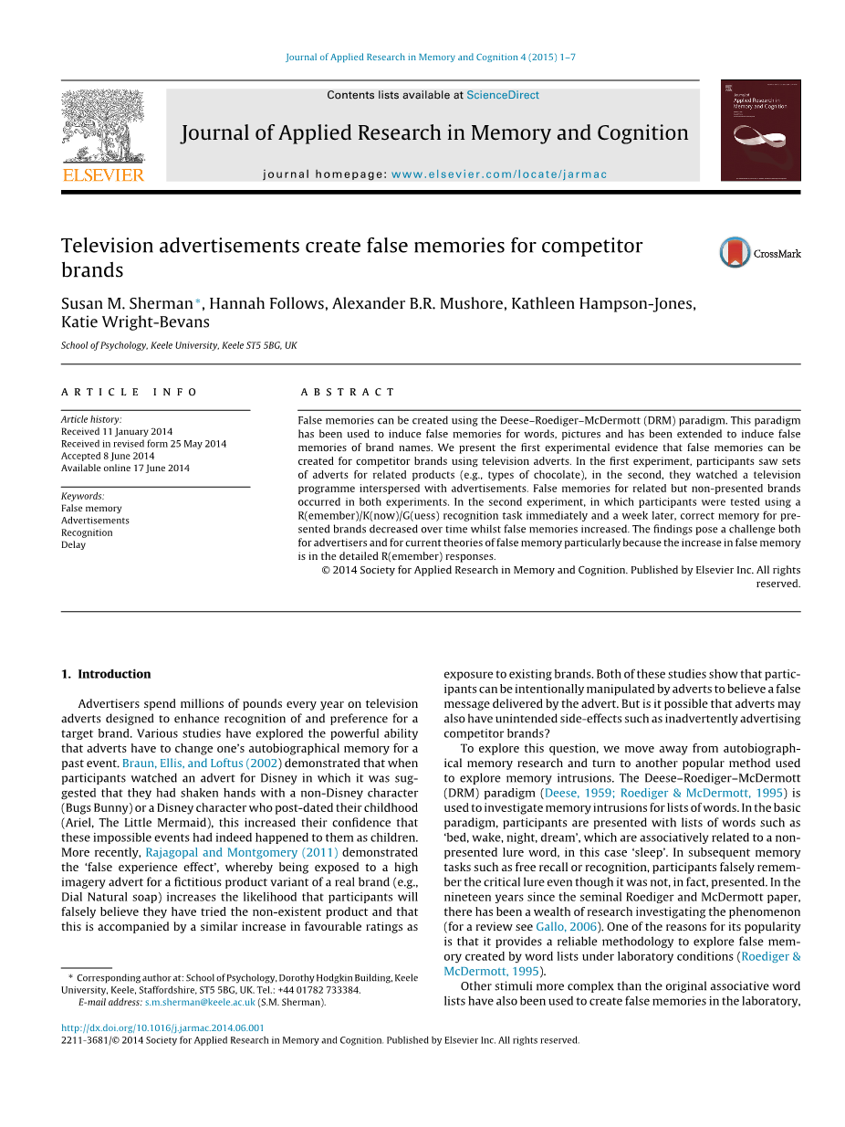 虚假记忆可以通过利用DRM模式创建。这种模式被用来诱发虚假的信息、图片记忆,甚至扩展到虚假的品牌记忆。现在利用第一个实验来证实我们可以通过电视广告为竞争对手品牌创建虚假记忆。在第一个实验中,参与者可以看到一些相关产品的广告(如各种类型的巧克力),然后,他们观看了一个插入广告的电视节目。在这前后两个实验中,在没有向实验对象呈现品牌信息的情况下,虚假记忆出现了相关性。在第二个实验中,测试过程中,参与者通过使用R(记住)/ K(现在)/ G(问题)立即完成识别任务或者一周后来完成识别任务。结果显示,参与者对于正确品牌信息的记忆随着时间的推移而减少,相反来说虚假记忆增加了。这个结果给广告商和当前虚假记忆理论特别是因为在详细的R(记住)反应导致虚假记忆的增加构成的挑战。