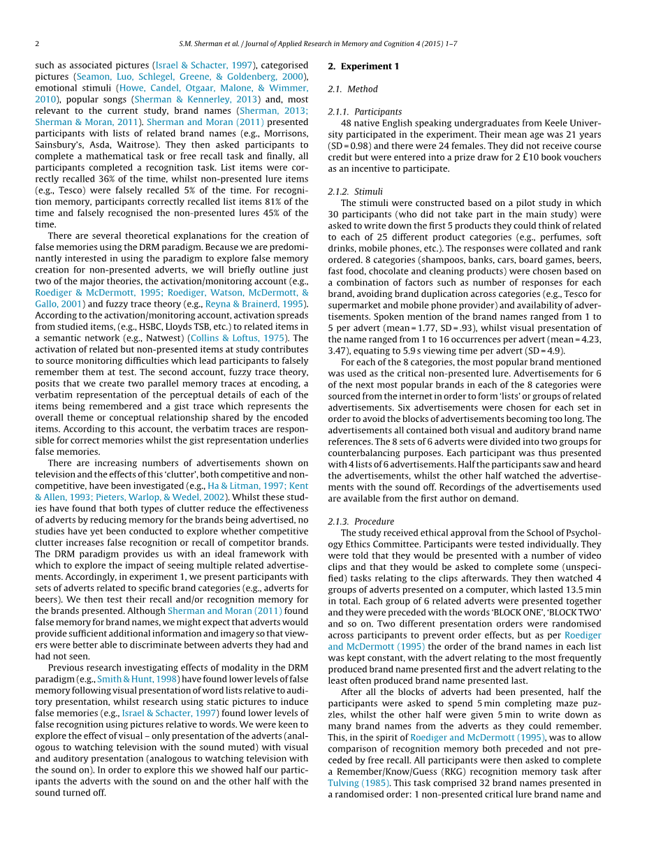 越来越多的虚假广告出现在电视上并且造成了 “混乱”的影响。无论是竞争性或者非竞争性的广告都被展开了查处(如:哈利特曼,1997;肯特amp;艾伦,1993;彼得,沃尔普amp;威德尔,2002)。虽然这些研究发现,这两种类型的混乱通过减少广告的有效性从而减少品牌广告的记忆,但如今还没有对竞争混乱增加是否影响竞争对手品牌虚假信息的识别或召回进行研究探索,DRM模式为我们探索多个相关广告的影响提供了一个理想的框架。因此,在实验1中,我们给参与者的广告是特定品牌类别(如:啤酒广告)。然后我们测试他们对品牌的回忆和/或识别记忆。尽管谢尔曼和莫兰(2011)发现品牌虚假记忆,我们可能会认为广告能够提供足够的附加信息和图像,以便观众能够更好区分他们以前并没有见过广告。