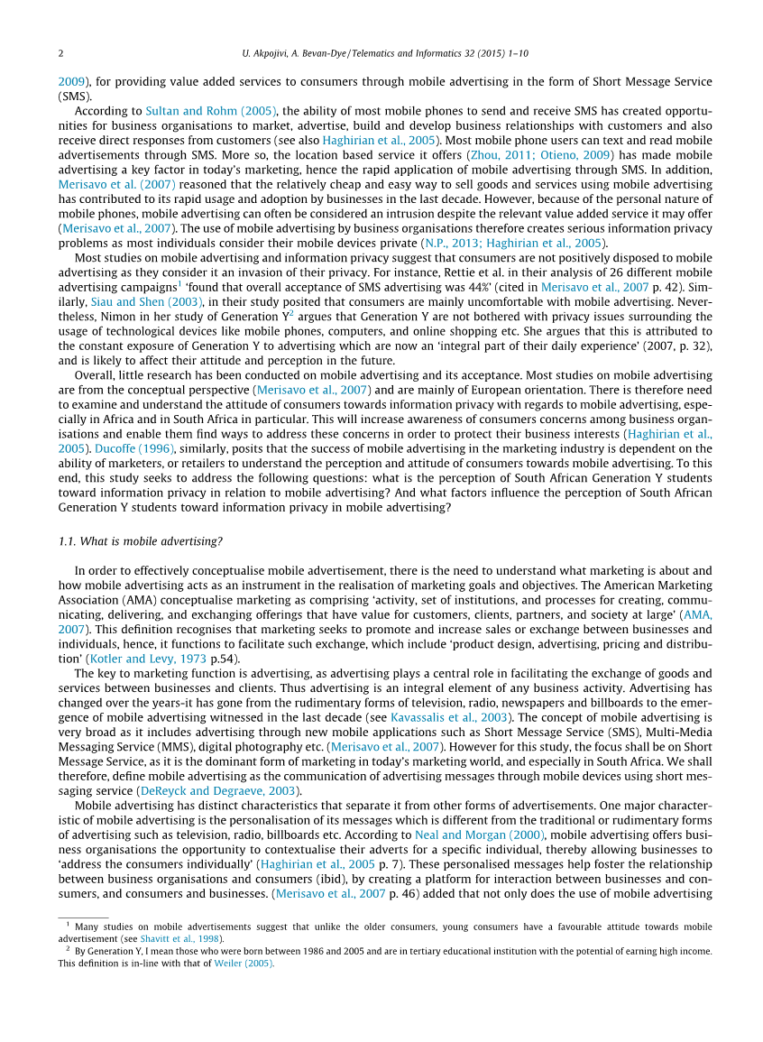 根据苏丹和美国(2005),大多数手机发送和接收短信的能力创造了市场机会的商业组织,宣传,建立和发展业务关系研究客户并从客户收到的直接反应(参见haghirian et al.,2005)。大多数手机用户都可以通过手机短信来阅读手机广告。更是如此,基于位置的服务,它提供了(Zhou,2011;Otieno,2009)取得了移动广告在今天的市场营销的一个关键因素,因此,快速应用移动广告通过短信。此外,米erisavo等人。(2007)认为,相对便宜和容易的方式推销商品和服务的使用移动广告贡献了近十其快速的使用和通过企业的。然而,由于个人的性质手机,手机广告往往被认为是一种入侵尽管相关增值服务可以提供(merisavo et al.,2007)。通过业务organisa移动广告的使用并因此创造大多数人认为他们的移动设备上的私人信息严重的隐私问题(N.P.,2013;haghirian et al.,2005)。大多数移动广告和信息研究信息隐私建议消费者不积极配置移动广告作为他们认为这侵犯了他们的隐私。比如,雷蒂等人。在他们的分析中有26种不同移动广告campaigns1”发现,短信广告的整体验收44%”(引用merisavo et al.,2007,p. 42)。同样,萧与沈(2003),在他们的研究中指出,消费者再主要是不舒服的移动广告。然而,在她代Y2研究nimon认为Y一代不打扰周围的技术的使用的隐私问题设备如手机,电脑,和网上购物等,她认为这是由于Y一代广告,现在是一个整体的一部分,他们的日常的不断曝光经验(2007,32页),很可能会影响他们的态度和看法,在未来的整体,小的研究已经进行了移动广告和它的接受。多数民众的研究而广告