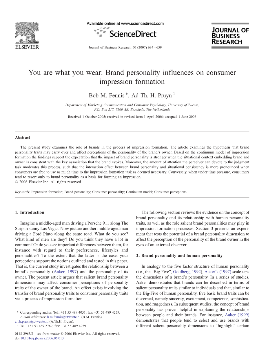 接下来的部分回顾关于品牌个性概念的证据及其与人格特质的关系,以及显著品牌个性在印象形成过程中可能发挥的作用。第3节介绍一个实验,该实验测试了在外部观察者眼中品牌个性维度影响品牌所有者的个性的感知的潜力。