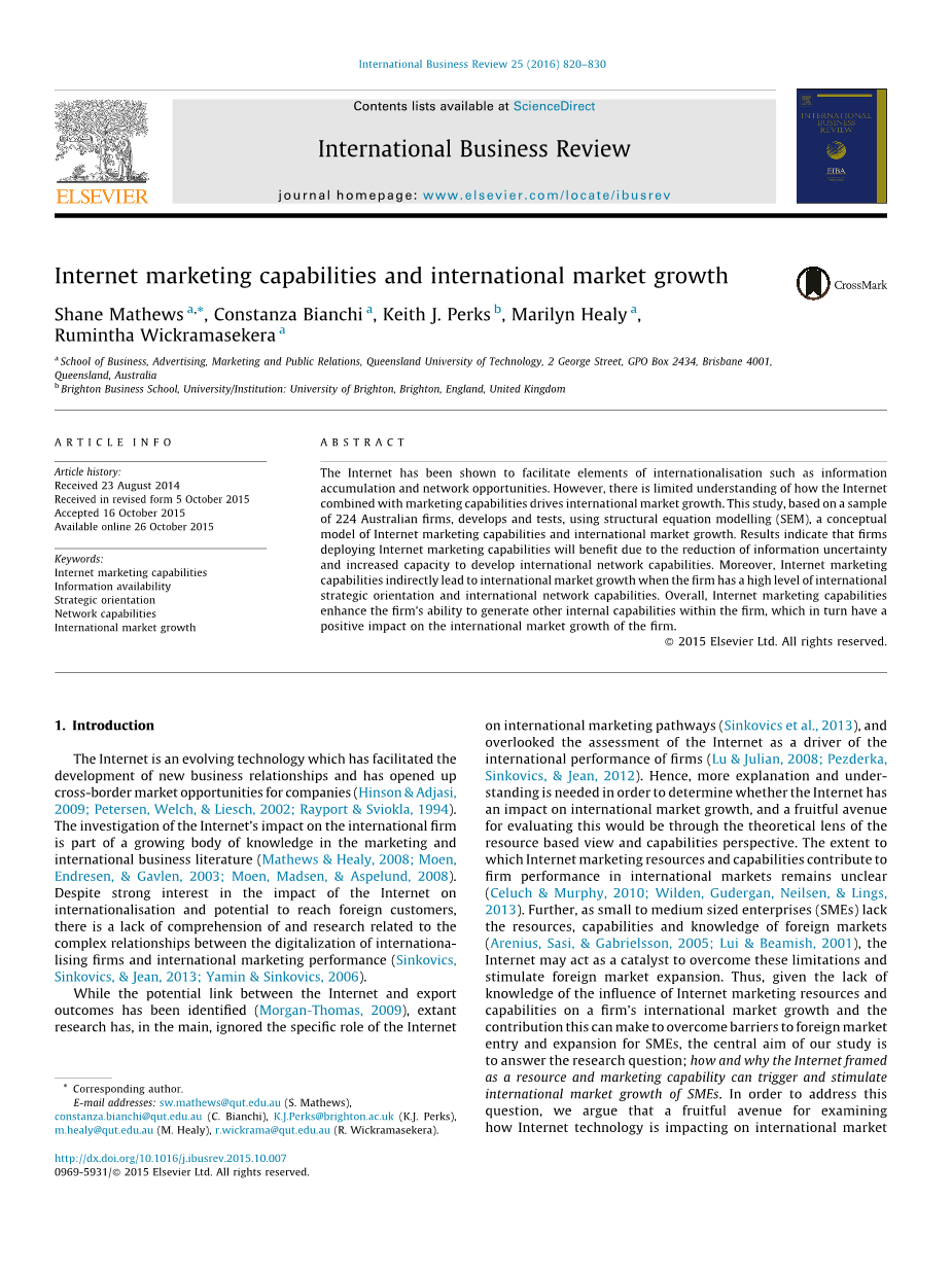 互联网已经显示出促进国际化的元素,如信息的积累和网络的机会。然而,对于互联网与营销能力相结合如何能推动国际市场增长,目前的理解依然相对局限。这项研究基于224个澳大利亚公司的样本,通过开发与测试,使用结构方程模型(SEM),这个模型是互联网营销能力和国际市场增长的概念模型。结果表明,企业部署互联网营销的能力将受益于信息不确定性的减少和国际化网络功能的提升。而且,当公司具有高水平的国际战略方向和国际网络能力时,互联网营销能力将间接导致国际市场增长。总体而言,互联网营销能力提高公司的潜力,从而对公司的国际化发展产生了积极的影响。