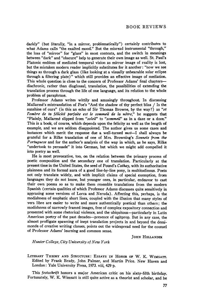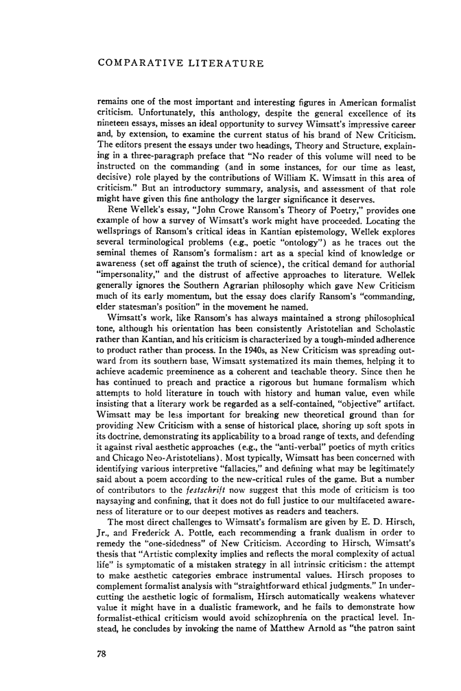 这本纪念文集是为了祝贺一位美国主流批评家的60岁生日。幸运的是,作为一位理论家兼学者,维姆斯特仍然十分活跃。此外,在美国最正式的批评领域,他始终是最重要和最有趣的人物之一。不幸的是,尽管这份选集中的19篇文章在整体上是非常优秀的,但是错失了一个理想的机会,没能纵览他的卓越成就,而是在一定程度上反映了现今他在新批评上面的地位。编辑用两个标题来统领这些文章,即理论和结构,并且用三个段落的前言做了这样的解说:对维姆萨特在这个批评领域所做的至关重要的(在某种程度上,至少在我们这个时代是决定性的)贡献,这本书的读者都了然于心。但是,对其地位和贡献作一个介绍性的概要、分析和评价,可能会更加突出这本优秀文集的重要性。