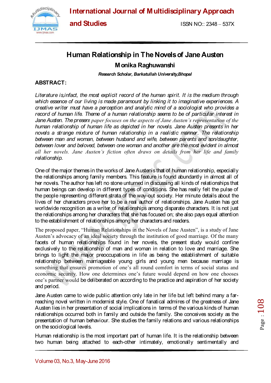 这篇论文题为《简·奥斯汀小说中的人际关系》,是对简·奥斯汀通过良好婚姻制度倡导理想社会的研究。她小说中涉及诸多人际关系,但本研究只局限于男女两性关系中的爱情与婚姻关系。奥斯汀揭示了生活中当务之急是建立合适的适婚年轻男女之间的关系,因为婚姻是一种能确保人在社会地位和经济安全方面得到安全感的东西。一个人如何决定自己的未来取决于如何选择伴侣,而这又取决于她的社会实践和时代因素。