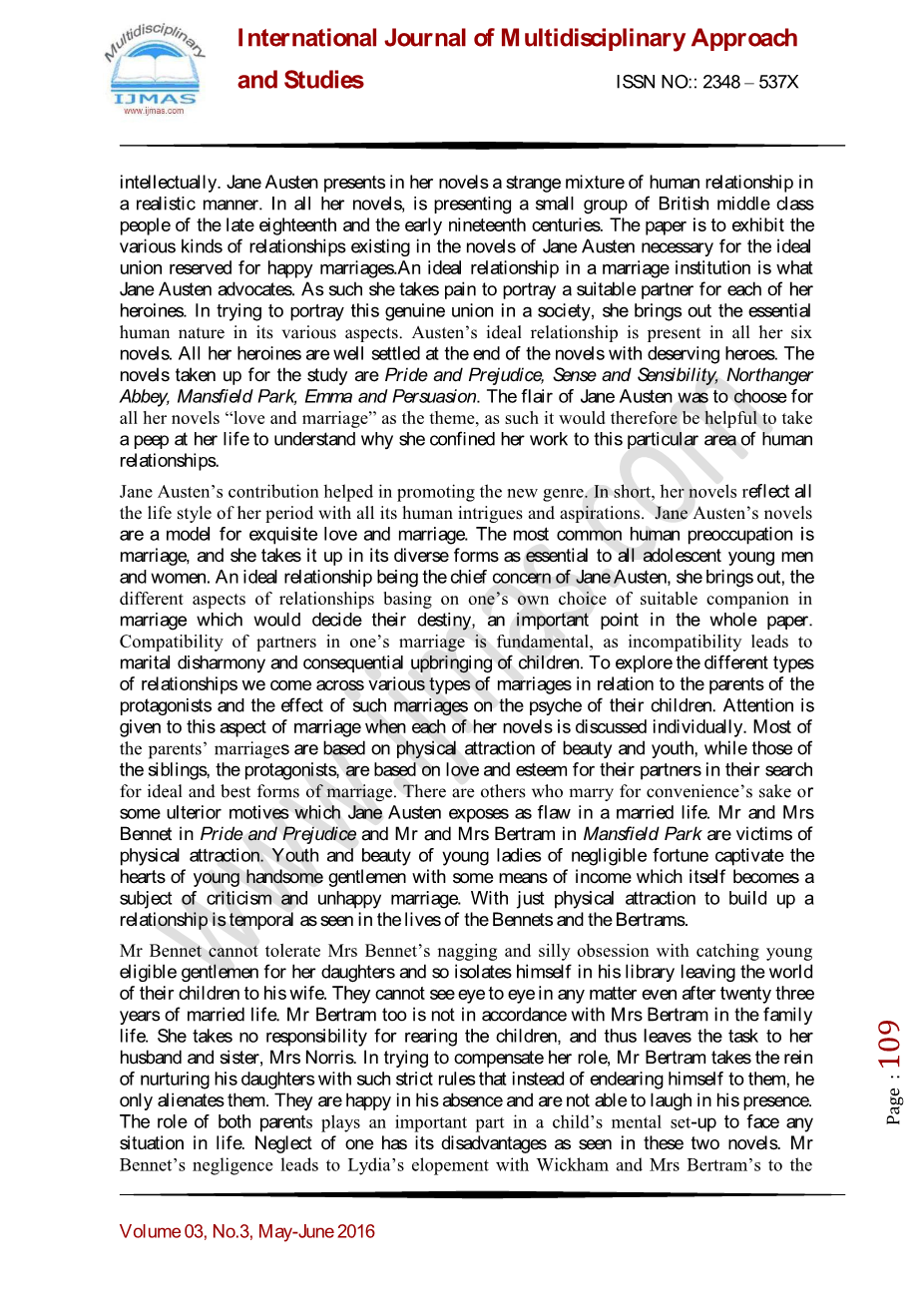 简·奥斯汀的文学贡献在于推动这一新的流派发展。奥斯汀的小说反映了她那段时期的所有生活方式,以及人类阴谋和抱负,简·奥斯汀的小说是爱情和婚姻的典范,她把爱情和婚姻的形式多样化。理想的关系是奥斯汀的主要关注点,她提出关系的不同方面取决于一个人在婚姻中是否选择了合适的伴侣,这将决定他们的命运,这是整篇论文的一个重要观点。婚姻中伴侣的相容性是最基本的,因为不相容会导致婚姻不和谐和对子女的间接影响。为了探索不同类型的关系,我们会遇到各种类型的婚姻,涉及到主角的父母和他们婚姻对他们孩子心理的影响。大多数父母的婚姻是基于对美和青春的身体吸引力,而年轻一辈的婚姻则是基于对伴侣的爱和尊重,但还有一些人为了方便起见而结婚,甚至有些隐秘的动机是在婚姻生活中暴露出来的。在《傲慢与偏见》中的班纳特夫妇,在《曼斯菲尔德庄园》中的伯特伦夫妇都是因美貌吸引而结婚的受害者。年轻女性的青春和美丽吸引着拥有高收入的绅士的心,而这种只有身体上的吸引与财富收入建立起的婚姻关系本身就是不幸的,这在班纳特和伯特伦夫妇的生活中有所体现。