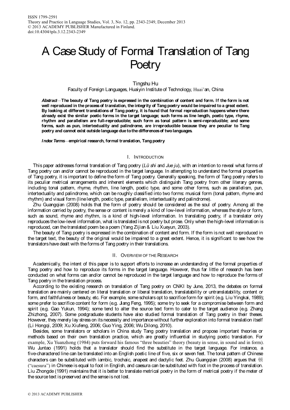 在现有的唐诗翻译研究中,注重诗歌内容,形象,情感,精神和意义的翻译,而不是形式翻译。本文是对其正式翻译的尝试。