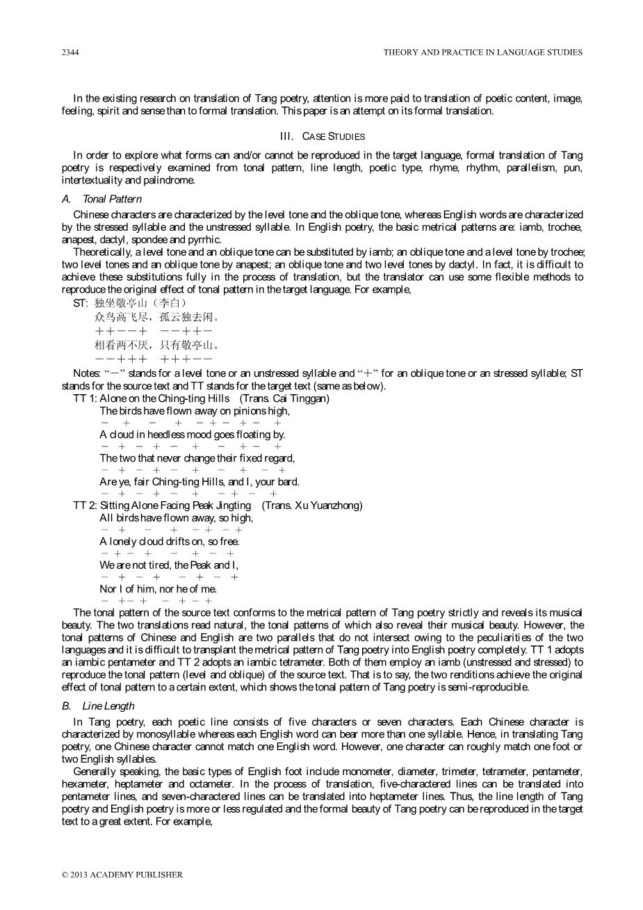 另外,中国的一些译者或学者在研究唐诗翻译时,根据自己的翻译实践提出了重要的理论或方法,对研究诗歌翻译有很大的影响。例如,许元忠(1984)提出了他着名的“三美女”理论(美,意,音,形)。吴军涛(1991)认为,译者应该在目标语言中找到替代者。例如,一个五行字符可以翻译成英文诗歌,五,六,七英尺。中国汉字的音调模式可以用汉语,汉语,最便宜和英式英尺替代。朱光谦(2008)认为中文中的顿(“caesura”)等于英文,在翻译过程中可以用脚代替caesura。刘忠德(1991)坚持认为,如果原文的米被保留下来并且意义不被遗失,那么最好是以格律诗的形式来翻译格律诗。