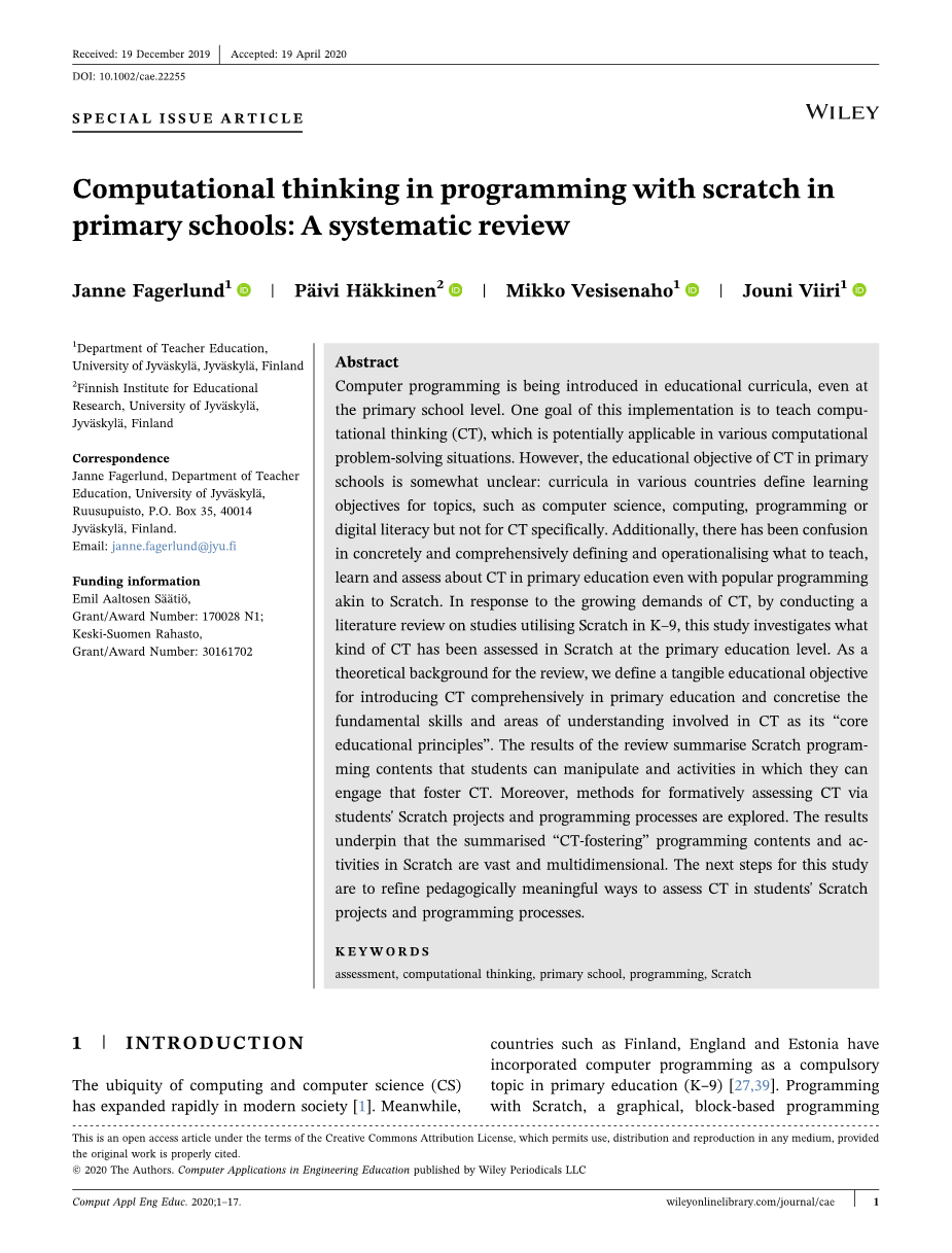 计算机和计算机科学在现代社会迅速发展。与此同时,芬兰、英国和爱沙尼亚等国家已经将计算机编程作为初等教育(K-9)的必修课程。用Scratch来编程,一个图形化的,基于模块的编程语言,在这个年龄段尤为欢迎,这为教育研究提供了一个潜在的影响背景。然而,一些学者认为编程教育本身并非目的,而是为了培养计算思维(即其中涉及的认知任务),尽管不是排他性的。计算思维是一个总称术语,它体现了理解计算世界、使用本学科和跨学科的多维问题解决技能所必需的知识基础。