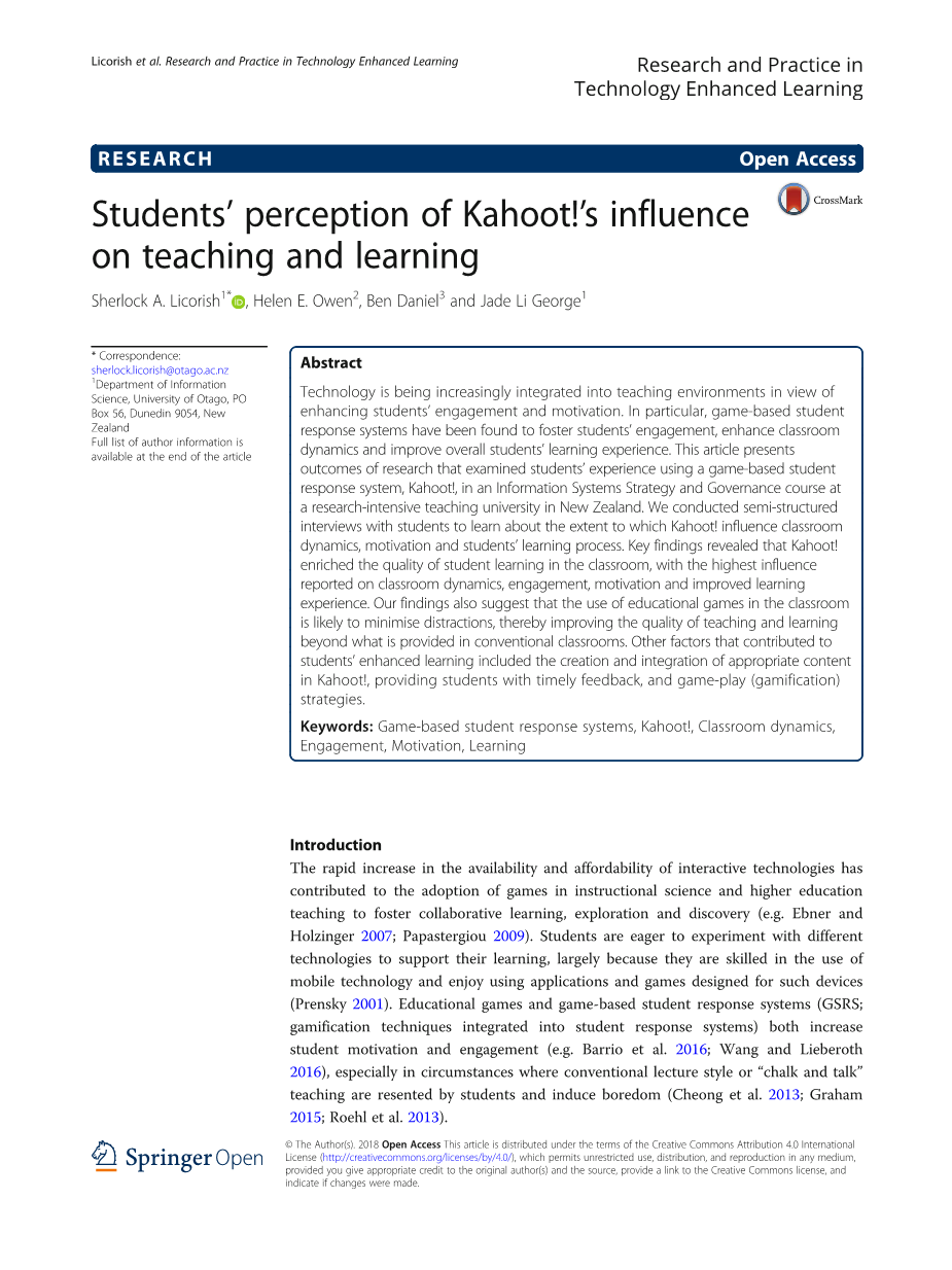 除了丰富学习之外,GSRS的有效性还取决于学生是否认为游戏具有吸引力,可访问性,有用性和高质量。就是说,尽管长期使用GSRS对学生的交流和娱乐产生了很小的“磨损效应”(Wang,2015年),但在整个学期课程中继续使用GSRS的学生仍报告了其对Licorish等人的积极影响。技术增强学习的研究与实践(2018)13:9第5