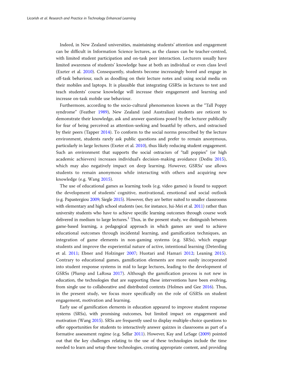 此外,根据被称为“高罂粟综合症”的社会文化现象(Feather 1989),新西兰(和澳大利亚)学生不愿公开展示自己的知识,询问和回答讲师提出的问题,因为他们担心被别人感知。 寻求别人关注和夸耀,并被同伴排斥(Tapper 2014)。 为了符合讲课环境规定的社会规范,学生很少提出公开问题,而宁愿保持匿名,特别是在大型讲课中(Exeter等人,2010年),从而有可能减少学生的参与度。 这种环境支持“高罂粟花”(或学业成绩优异)的社会排斥,增加了个人的决策回避(Dediu 2015),这也可能对深度学习产生负面影响。但是,GSRS的使用允许学生在与他人互动和获取新知识时保持匿名(例如Wang,2015年)。