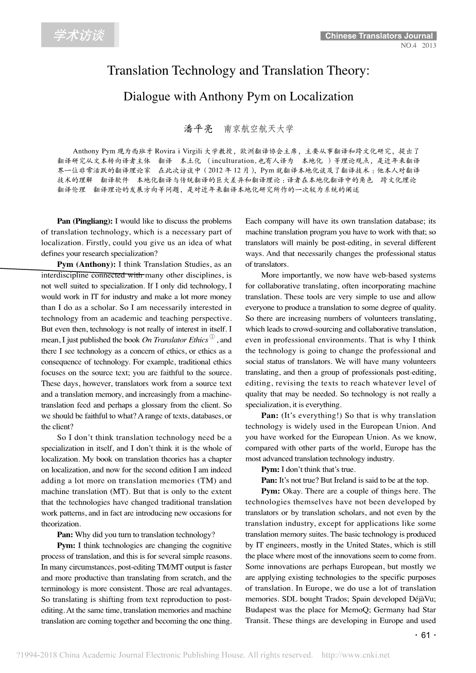 潘:科技翻译或本地化翻译与文学翻译有很大不同。你认为什么理论框架可以用来指导本地化翻译?后置怎么样? 精神理论还是文化理论?他们还在为翻译技术工作吗?
