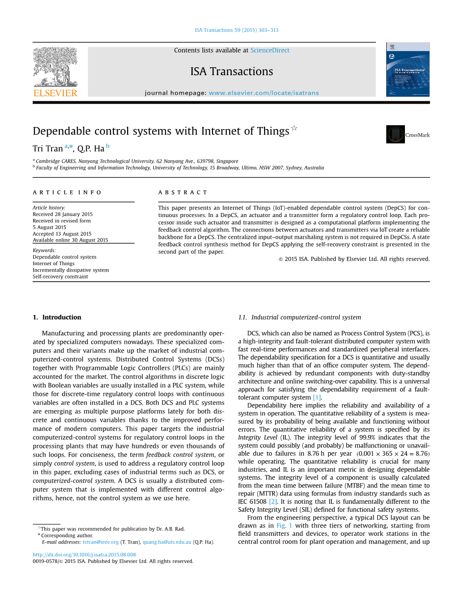 本文的贡献是四倍,可总结如下︰firstly提出了DCS的折叠不必要的系统层次结构从旧式设计新的体系结构。不仅强调了业务功能,可靠性和可用性的新建筑也处理。第二,与工作在和谐沟通通过物联网的四个匿名(或自治区)控制器介绍一种可靠的控制系统新结构。DepCS的新结构消除了ineffi系数总和中经典的方法,模拟和硬连线的信号用于产出在过去处理计算平台的能力有限。第三,与DepCS的完全自治结构,插即用-设计未来控制系统变得可行。同样,昂贵的输出编组系统并不需要了,将会使未来的系统更卓有成效的制造、安装、实施和操作。最后,采用增量耗散系统的selfrecover约束的新型控制合成方法开发并给出了详尽的数值模拟。这种方法是有效的真正是时间,因为它是触发eventbased接近那只重新计算责任待机状态转移过程中的反馈增益。在剩余的时间间隔时间只有静态收益并用。