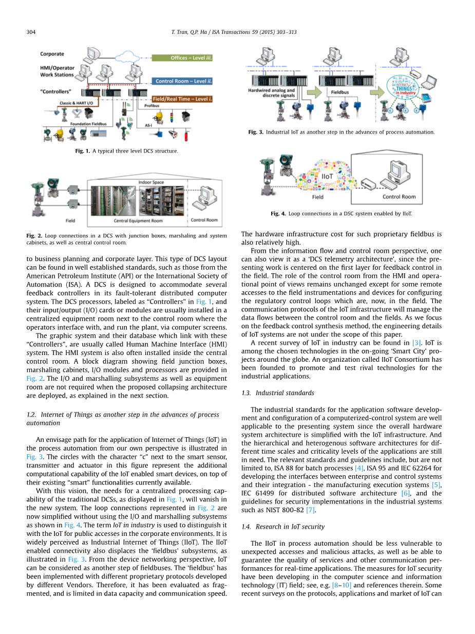 从信息佛罗里达州和控制室的角度看,一个人也可以查看它作为DCS遥测体系结构,因为提出工作中心first层反馈控制的field。控制室从HMI的作用操作的观点和角度保持不变,除了对一些远程访问field仪器和设备confi起监管控制回路之外,现在field,物联网基础设施的通信协议将管理数据flows之间控制室和fi括。当我们集中反馈控制合成方法,物联网系统的工程细节并非根据本文的范围。