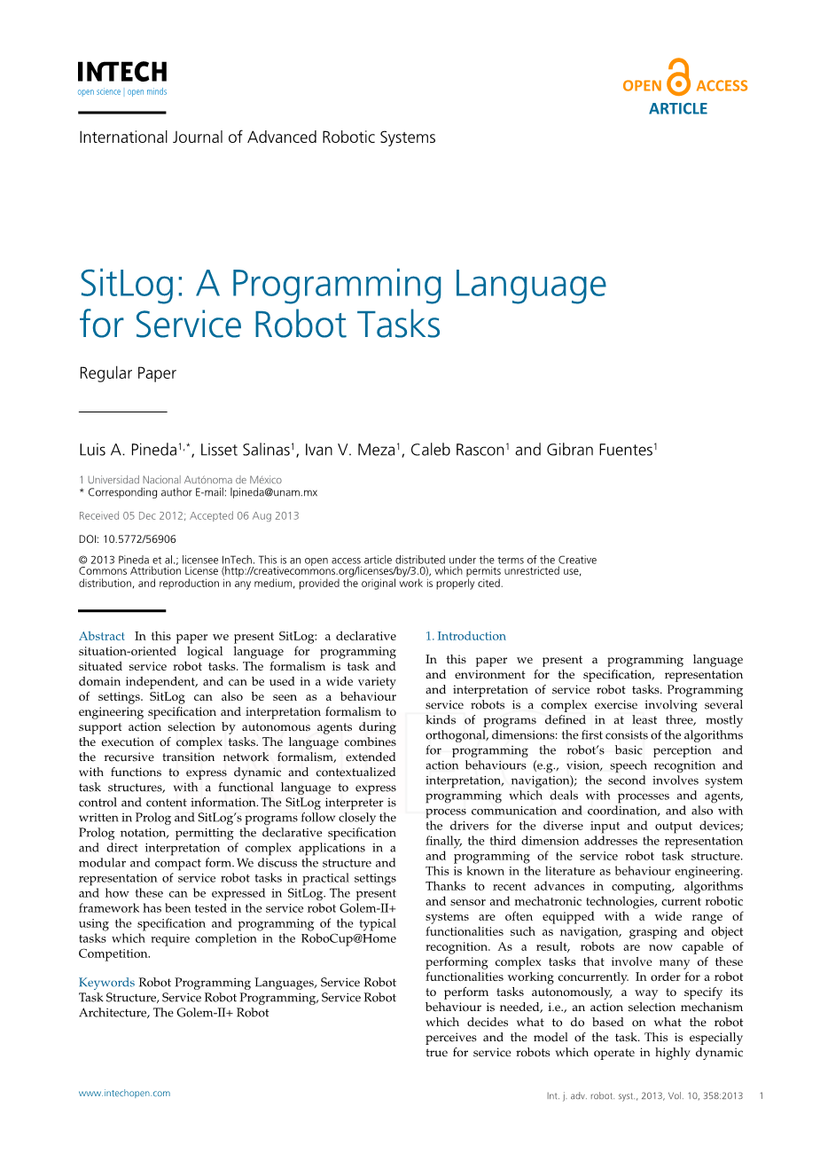 - 我们提出并演示SitLog的程序规范和解释方法。它们紧跟着开端符号和系统核心,包括一前一后两个解释程序。第一个实现了F-RTN模型(即遍历递归图),第二个解释程序表达式的函数语言称为L,通过DMS的内容和控制信息来表达。DMS的图解表示方法也在这一章节给出。这种结构的说明用两个方面加以描述,其一是固定的规格,其二是服务机器人常用的一种典型的脚本程序,如在Robo Cup@Home Competition情况下的程序。DMS的表示独立于感知和行动模式之外,SitLog的程序需要与实际解释相关,并且由机器人执行任务时表现出来。因此,SitLog的解释是嵌入在机器人的体系结构之中。