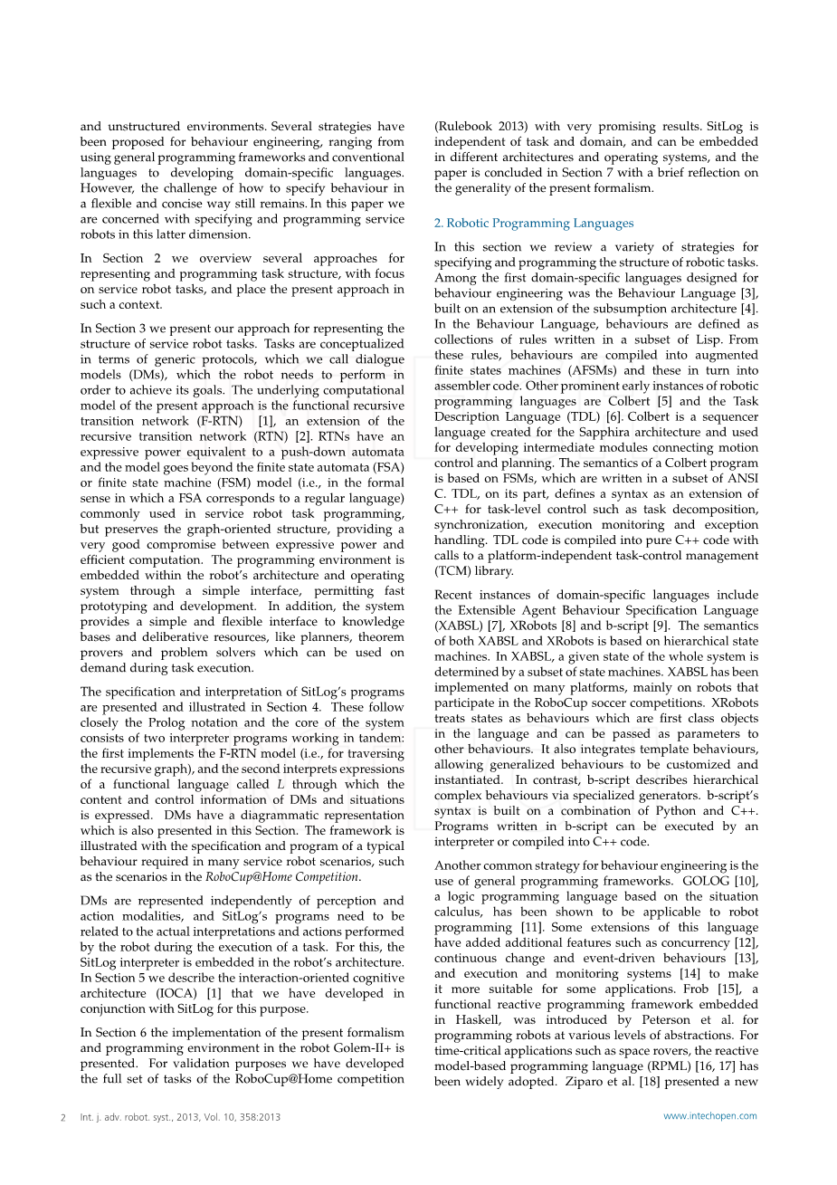 在第六节中,我们提出如何实现机器人Golem-Ⅱ的当代形式体系和编程环境。为了验证我们的目的,我们对RoboCup@Home Competition研发出了一整套的验证办法(见2013年蓝皮书),并取得了满意的结果。SitLog在工作及相关领域内独立存在,并且它应用于不同的体系结构和操作系统中。在本文第七节我们队当前的形式体系做了简单总结反思。