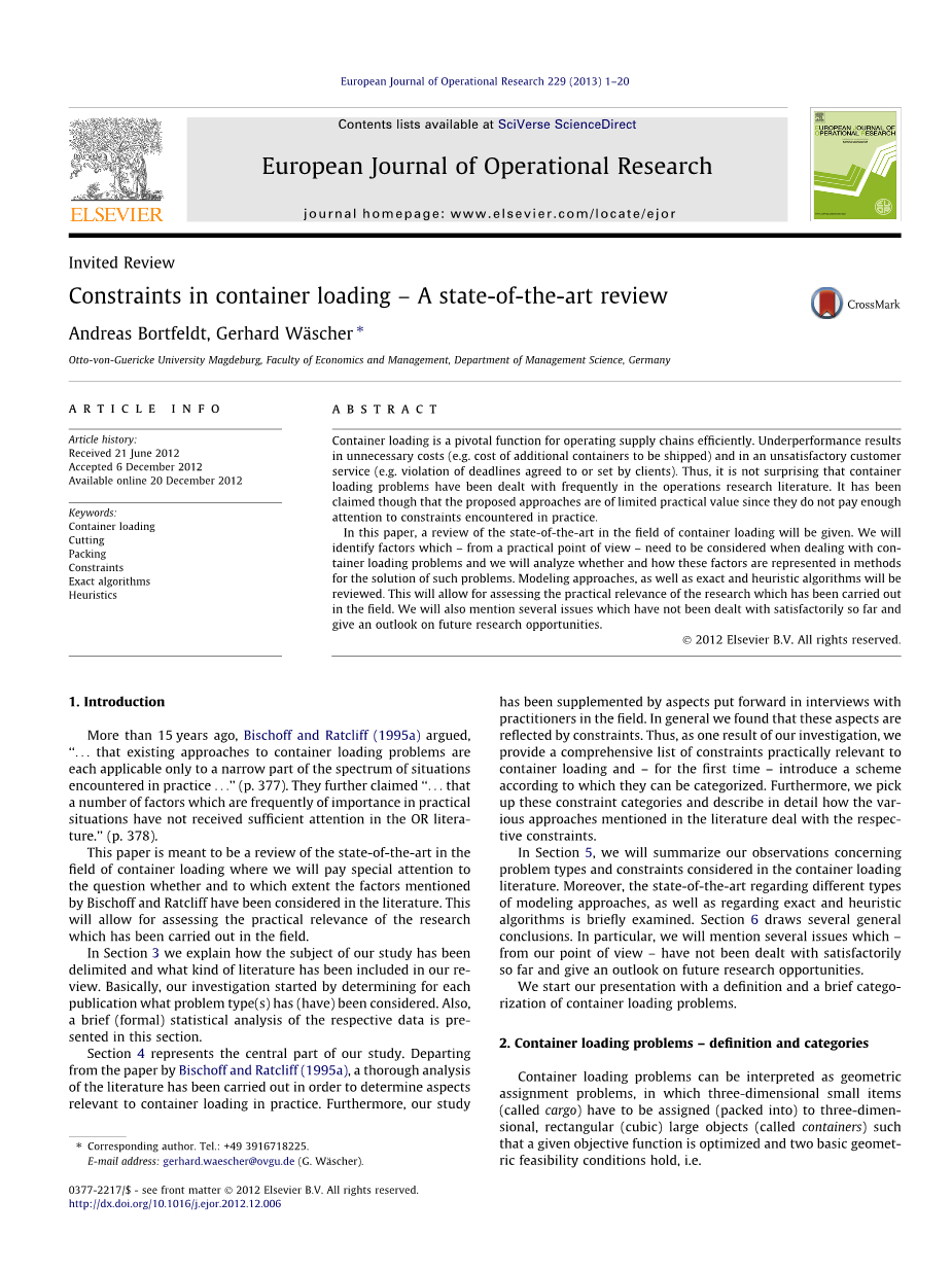 这篇论文旨在论述装箱领域的发展现状,将对Bischoff和Ratcliff所提到的因素在文献中是否被考虑到、以及被考虑到什么程度给予特别的关注。这考虑到评估该领域中已进行的研究的实际相关性。