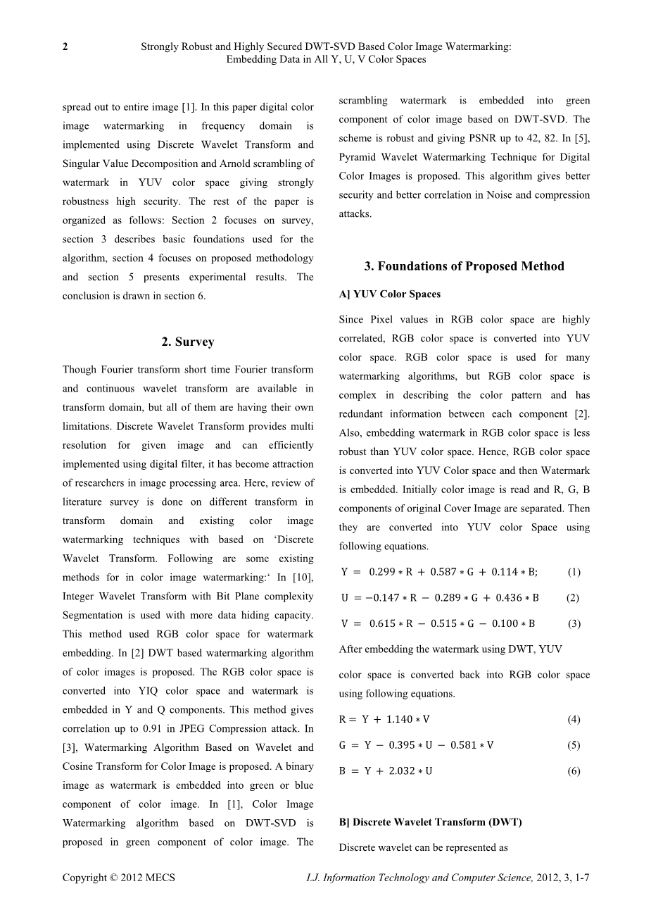 2 Strongly Robust and Highly Secured DWT-SVD Based Color Image Watermarking: Embedding Data in All Y, U, V Color Spaces