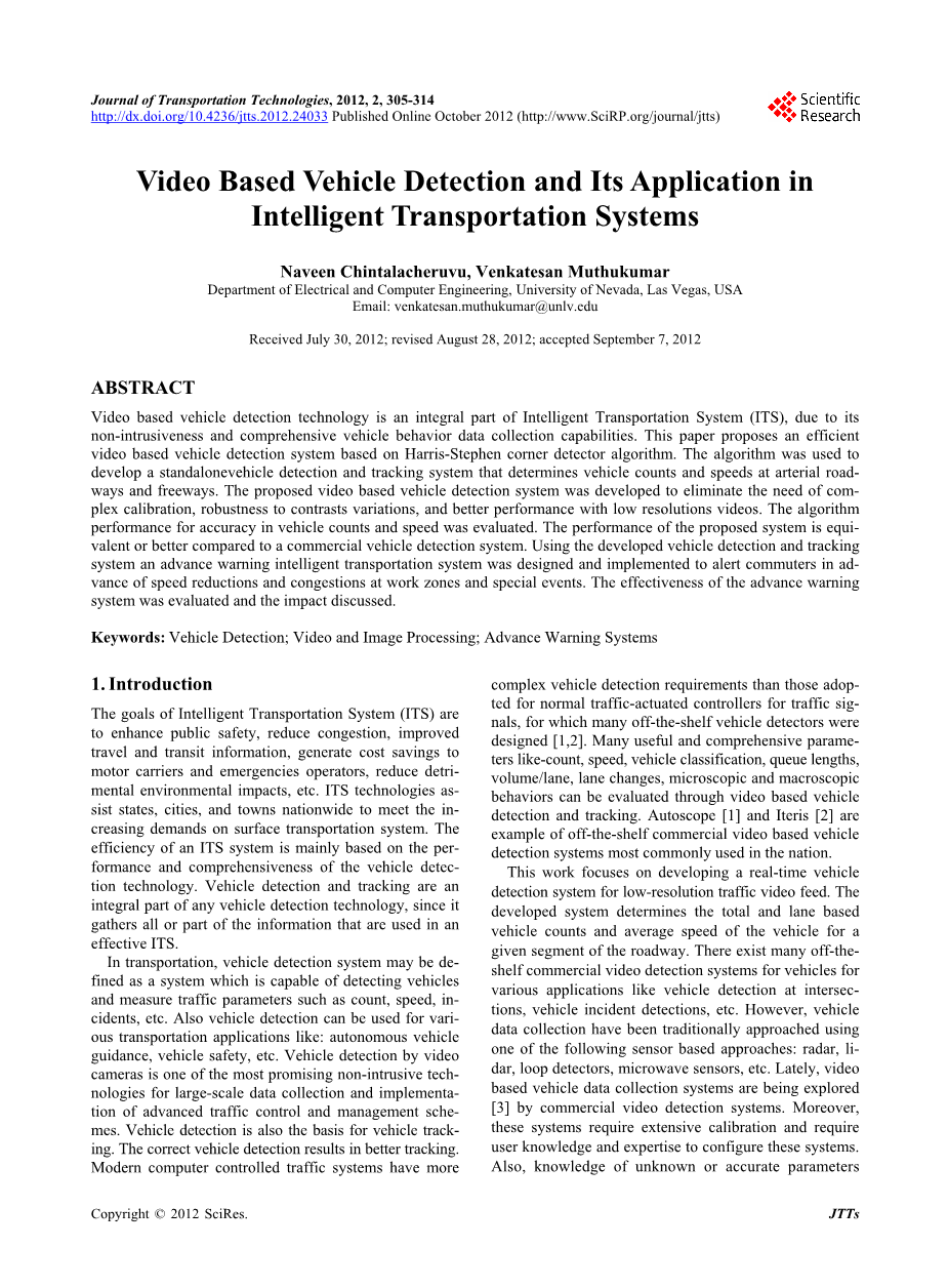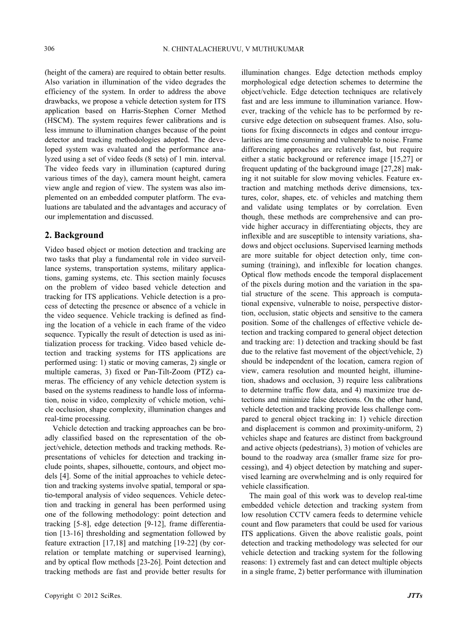 这项工作的重点是开发用于低分辨率流量视频馈送的实时车辆检测系统。开发的系统是用来确定道路的给定段的总车道和车道车辆计数和车辆的平均速度。还有许多用于车辆的商业视频检测系统,用于各种应用,例如车辆检测,车辆事件检测等。然而,传统上使用以下基于传感器的方法之一来接近车辆数据采集:雷达 ,循环检测器,微波传感器等。最近,基于视频的车辆数据采集系统正在通过商业视频检测系统进行探索[3]。此外,这些系统需要大量校准,并且需要用户的知识和专业知识来配置这些系统。此外,需要知道未知或准确的参数(摄像机的高度)以获得更好的结果。视频照明的变化也会降低系统的效率。为了解决上述缺点,我们提出了基于哈里斯-斯蒂芬角法(HSCM)的ITS应用的车辆检测系统。由于采用点检测器和跟踪方法,该系统需要较少的校准,并且对照明变化的免疫力较小。对发现的系统进行了评估,并使用一组1分钟的视频馈送(8组)进行了性能分析。视频馈送在照明(在一天的不同时间捕获),摄像机安装高度,摄像机视角和视野不同,该系统也在嵌入式计算机平台上实现。对表格列表和实现的优点和准确性进行了讨论。