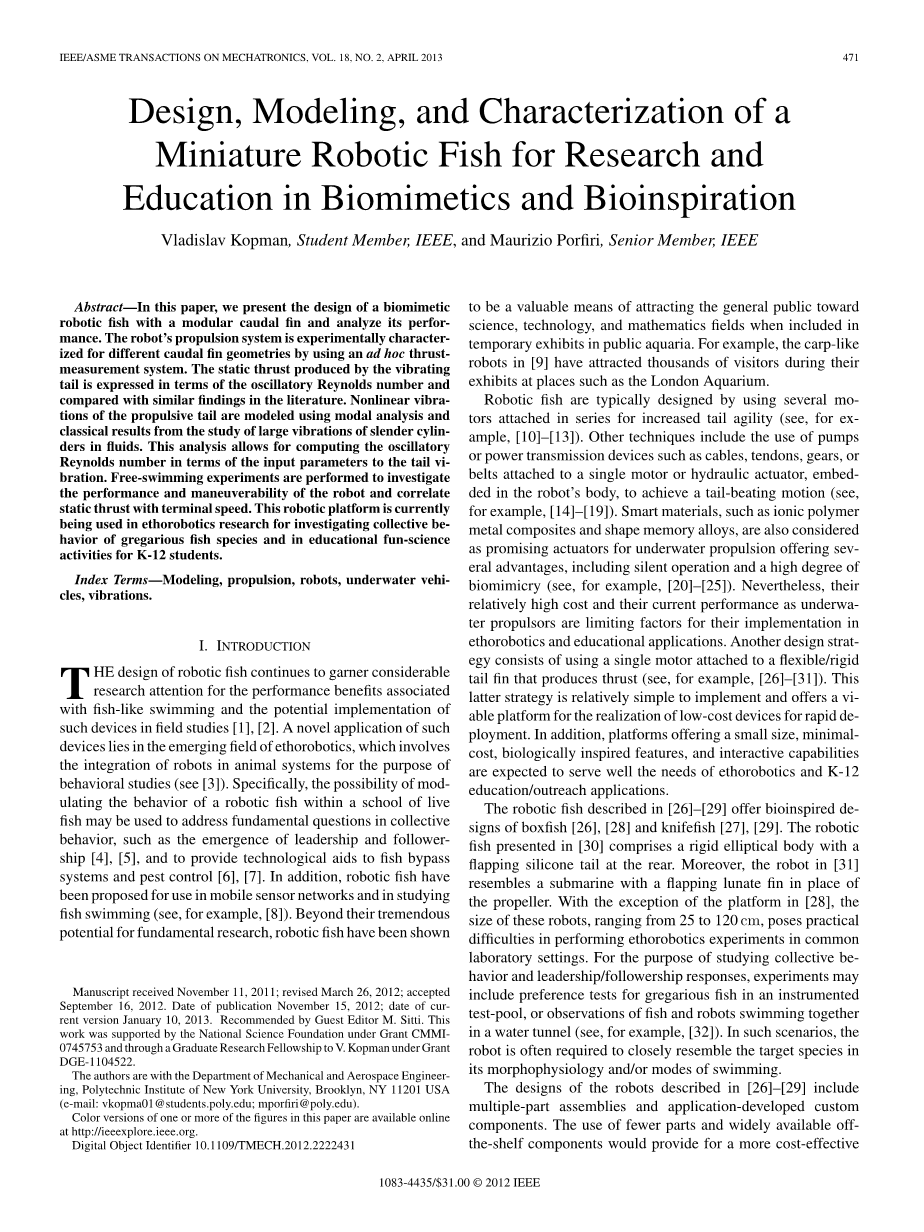 针对生物灵感和仿生学的研究教育而进行的微型机器鱼的设计、建模和表征