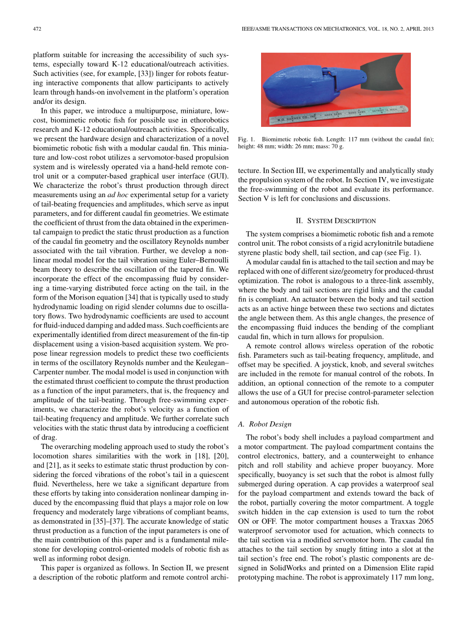 在本文中,我们介绍了一种多用途、小型、低成本的仿生机器鱼可能使用在仿生机器人研究和中小学教育/外联活动中。具体来说,我们提出了一个新的仿生机器鱼的模块化尾鳍的硬件设计和特性描述。这个小型的、低成本的机器人利用一个基于伺服马达的推进系统,并且是通过手持遥控器或计算机图形用户界面(GUI)的无线操作。我们通过使用特定的自组实验装置直接测量各种尾部跳动的频率和振幅,并作为不同几何形状的尾鳍的输入参数,来描述机器人的推力生产的特点。我们从实验活动中获得的数据估计推力系数来预测作为尾鳍几何函数和与尾部振动相关的振荡雷诺兹数的静态推力的产生。此外,我们用欧拉-伯努利梁理论为尾振动开发了一个非线性模态模型来描述锥形鳍的摆动。我们把包括流体的影响通过考虑时变的分布力作用在尾部,以莫里森方程[34]的形式,通常用于研究刚性细长柱由于振荡流的水动力载荷。两个流体动力学系数被用来解释流体引起的阻尼和附加质量。这样的系数实验的确定利用基于视觉的采集系统直接测量鳍尖位移。我们提出了线性回归模型依据振荡雷诺兹数和KC数来预测这两个系数。模态模型结合估计推力系数计算推力输出作为输入参数的函数,也就是说,尾巴跳动的频率和幅度。通过自由游动实验,我们描述了机器人的速度作为尾拍频率和振幅的函数,我们通过引入阻力系数进一步关联这种速度与静推力数据。
