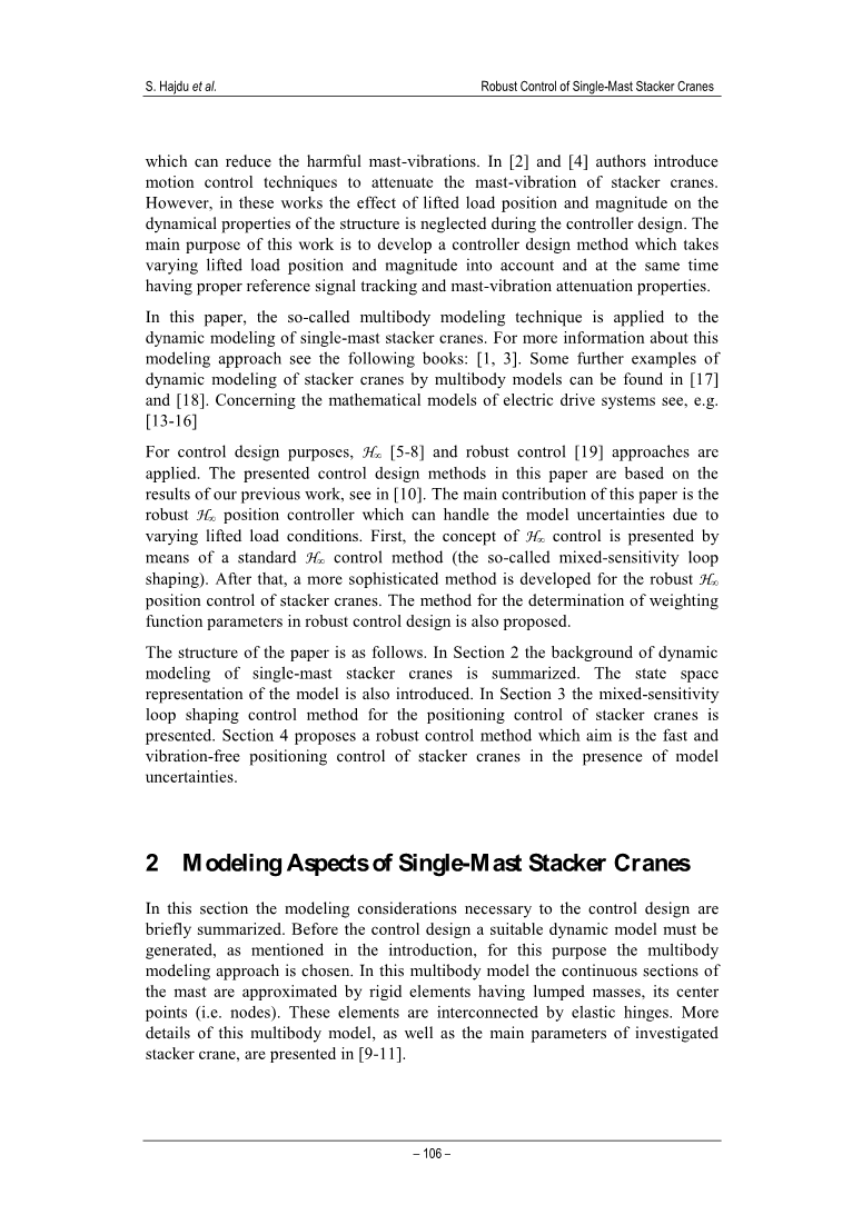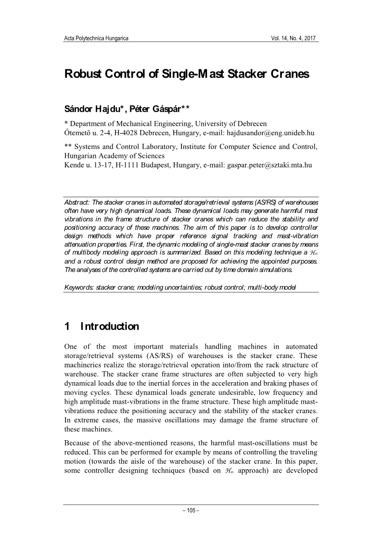 译文出处:Saacute;ndor Hajdu, Peacute;ter Gaacute;spaacute;r. Robust Control of Single-Mast Stacker Cranes [J]. Acta Polytechnica Hungarica, Vol. 14, No. 4, 2017.