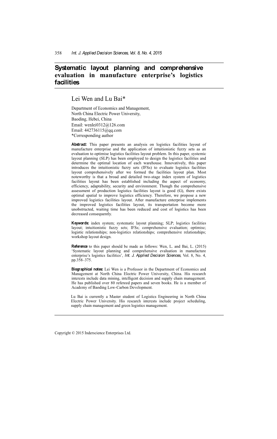 参考文献如下:雷文,鲁白(2015)《制造业企业物流设施的系统布局规划与综合评价》,《应用决策科学》,第八卷第四期,第358—375页。
