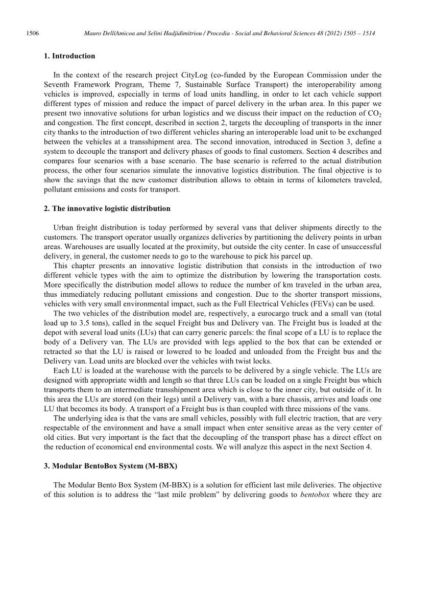 城市货物分配对经济很重要。然而,城市交通造成交通,噪音和污染。欧洲研究项目CityLog(框架计划7的一部分)旨在通过在包裹递送的背景下提出一种基于两种车辆和集装箱解决方案的物流模型来提高城市配送效率。当前的城市配送方案包括许多离开中心并驶向城市的车辆。用于城市交付的创新物流模型引入了一种概念,该概念使用两种类型的车辆:在仓库中装载有多个可以装载普通包裹的装载单元的货运巴士,以及是一辆具有高环保性的轻型车辆的送货车兼容的特性使其非常适合在市区内使用。当从货运巴士转移到送货车时,每个装载单元都取代了车厢。这些可互操作的车辆和集装箱形成了一条改进的物流链,减少了进入市区的车辆数量,行驶的油压计和污染物排放。当接收器在交付过程中不在家时,不必要的驱动式测高仪的另一个来源是交付失败。模块化BentoBox是项目引入的第二个概念。通过将货物交付到便箱,而不是交付给客户所在地,它可以在物流和客户利益的优化之间取得平衡。.货箱中存储着包裹,直到客户取货为止。模块化BentoBox系统引入了可移动模块的概念,即带有各种尺寸抽屉的手推车。这些手推车及其抽屉在仓库中装满了包裹。承运人将手推车运到市中心,然后将其插入便箱。通知客户后,便箱便箱中的包裹已准备就绪。为了访问包裹,顾客在用户界面上输入他的特殊代码。模块化BentoBox系统还可以配备称重和付款系统,用于运输包裹。运送货物的手推车由承运人带回仓库。这些CityLog概念将在2012年在三个欧洲城市中实施和测试:柏林,里昂和都灵。