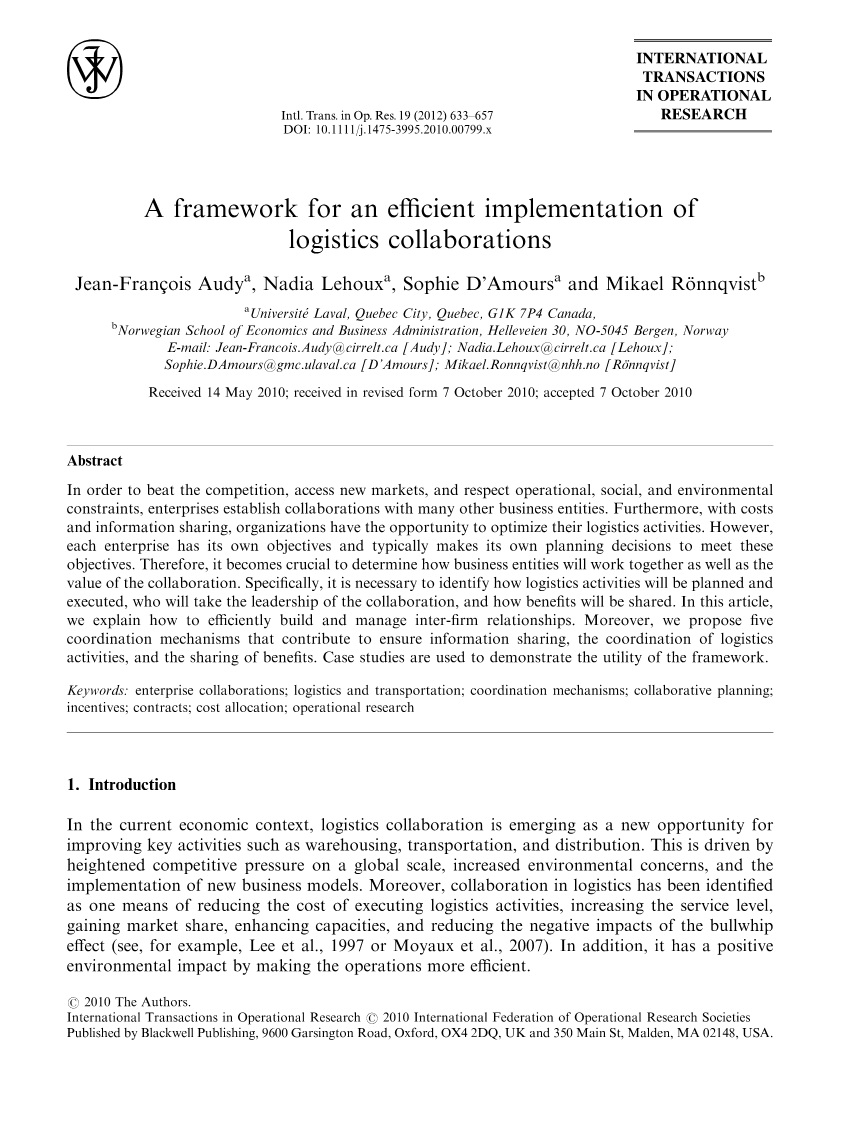 关键字:企业合作;物流与运输;协调机制;协同规划;激励;契约;成本分配;运作研究