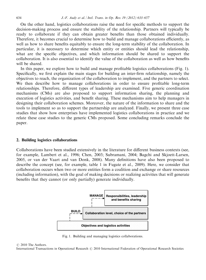 本文中,我们将探讨如何建立和管理盈利的物流合作(图1)。具体地,我们首先解释建立企业间关系的主要阶段,即达成的目标、组织的合作和实施以及合作伙伴的选择。然后,我们描述了如何管理合作,以确保长期盈利的关系。因此,不同类型的领导关系将被讨论。五个通用的协调机制(合作)也提出支持信息的共享,物流活动的规划和执行、利益的共享。这些机制的目的是帮助管理者设计他们的合作计划。此外,本文分析了共享信息的性质,实现的方式,以此支持合作伙伴。最后,我们提出了三个案例,这三个案例描述在实践中,企业如何实施物流协同合作,并且运用案例来验证五种机制实现的可能性。本文最后给出了结论。