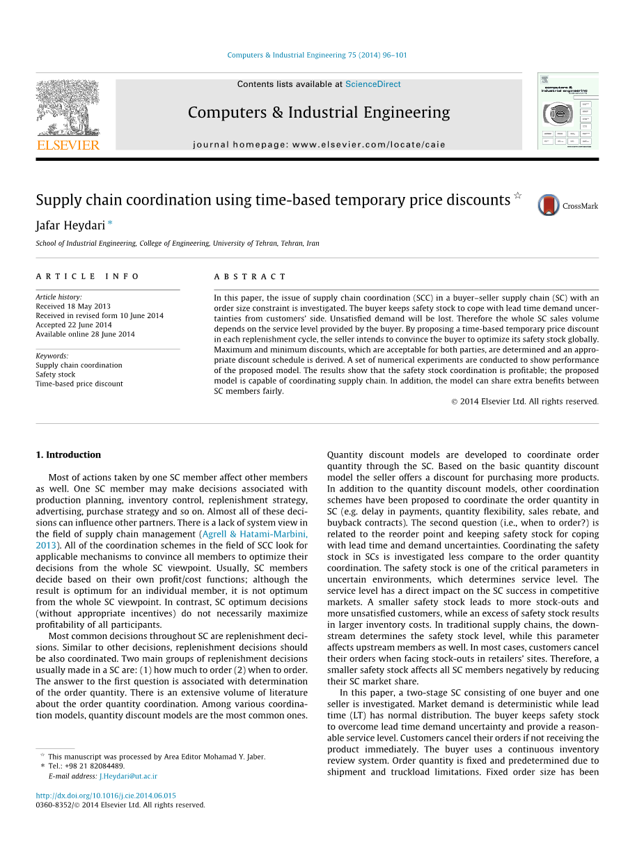 在本文中调查的是有一个卖方和一个买方的两阶段供应链。市场需求是确定的,提前期(LT)服从正态分布。买方通过保持安全库存来克服提前期需求的不确定性,并提供一个合理的服务水平。如果没有立即收到产品,客户将取消订单。所以买方使用一个连续的库存检查系统。订单数量是固定的,并且是由船载量和卡车装载的极限预定的。固定订单的大小已经在先前的研究中考虑好了(Chen, 1998, 2000; Chaharsooghi amp; Heydari, 2010; Heydari, 2014)这篇文章拓展了先前由Chaharsooghi and Heydari (2010)发表的文章,先前提到的研究显示了再订购点和安全库存集中决策的好处,而当前的研究侧重于通过提出一个适用的激励方案实现这种好处。在该模型中,卖家通过在每一个补货周期提供一个基于时间的临时价格折扣,试图诱导买方转向最优解。卖方在特定的时间提前提出临时价格折扣,以求转变买方订单的时机。这种机制不同于数量折扣模型;基于数量折扣模型, 购买超过一定数量卖方提供折扣(所有单元或增量)。数量折扣是用来改变买方的订单数量而决定的。然而,基于时间的折扣有能力改变订单的时间。制定模型,折扣模型的两个主要参数需要确定:(1)折现率(2)折扣计划。本文的两个主要方面:(1)协调安全库存,而主要文献考虑订货批量协调,(2)提出了一个完全适用于本研究问题的定制的基于时间的折扣。