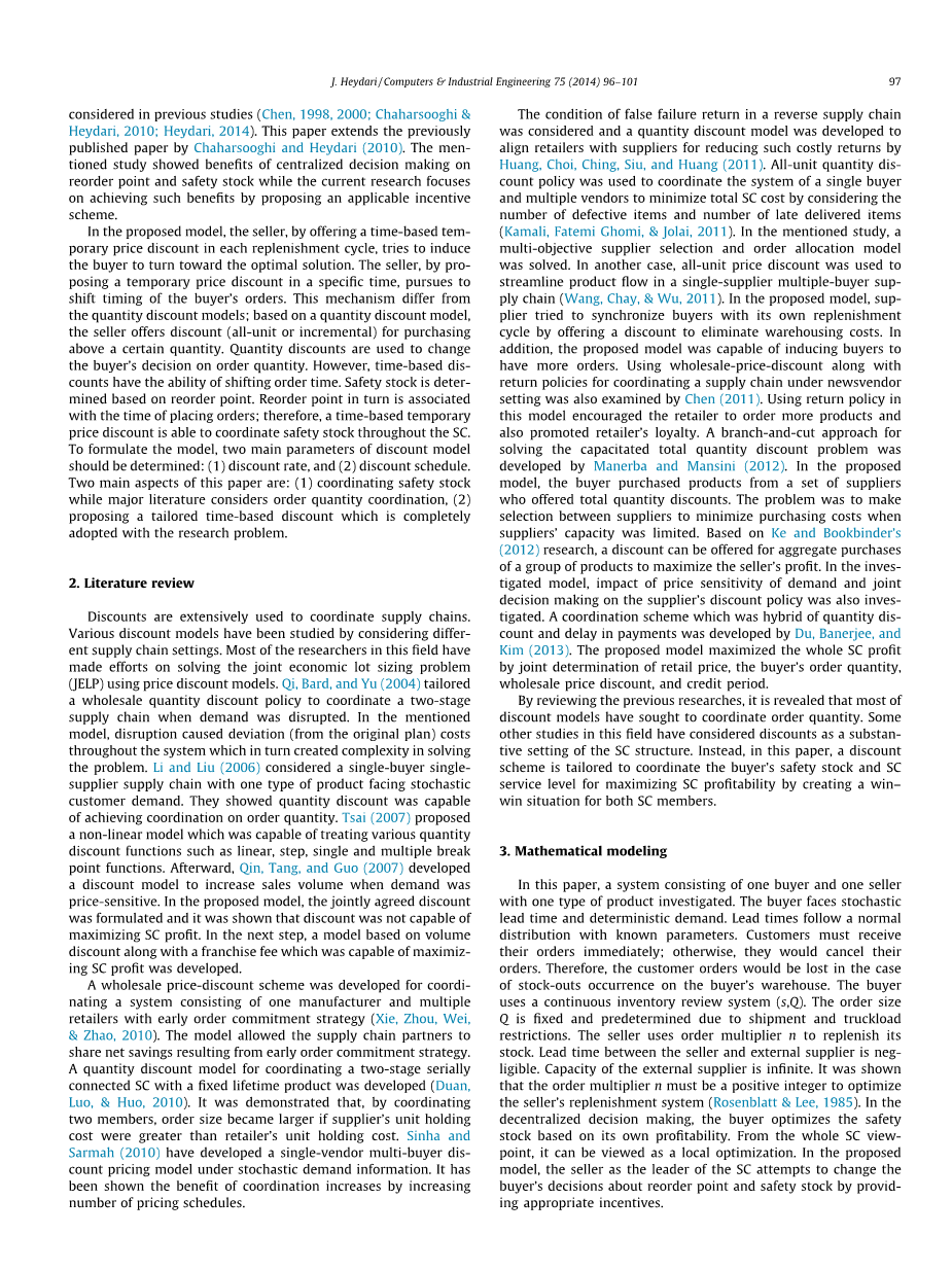 回顾以前的研究,发现大部分折扣模型试图协调订单数量。在这个领域的一些其他研究已经考虑折扣作为一个独立的供应链结构的设置。相反,本文折扣方案根据协调买方的安全库存和供应链服务水平最大化供应链盈利能力,创建一个供应链成员双赢的情形。