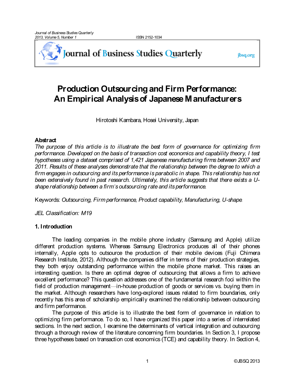 手机行业的龙头企业(三星和苹果)使用不同的生产系统,三星电子将所有的手机生产都在内部进行,而苹果公司选择将他们的移动设备的生产进行外包(Fuji Chimera Research Institute,2012)。虽然公司的生产战略不同,但它们在移动手机市场里都有非常显著的表现。这就提出了一个有趣的问题:是否有最佳程度外包,使企业获得更高的绩效?这个问题涉及生产管理领域的基本研究焦点——内部生产商品或服务,还是从市场上购买。尽管研究人员长时间的探索与企业边界有关的问题,但最近才有研究外包与企业绩效之间关系的学术经验。
