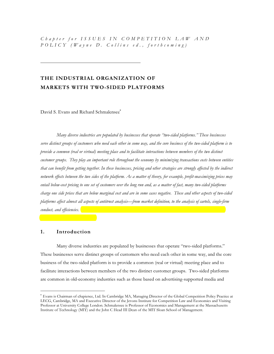 很多行业都是由经营企业填写“双面平台。”这些企业服务于客户的不同群体谁需要对方以某种方式,和双面平台的核心业务是提供一个共同的(真实或虚拟)会议地点,并促进两个不同的客户群体成员之间的相互作用。他们通过最小化,可以从聚会中受益实体之间的交易成本起到整个经济的重要作用。在这些企业,定价等策略在很大程度上受到平台的双方的间接网络效应的影响。作为一个理论问题,例如,利润最大化的价格可能意味着低于成本的价格向一组客户从长远来看,正如事实上,许多双面平台收取一面的价格是低于边际成本而且在某些情况下为负。的双面平台,这些和其他方面影响反垄断分析,从市场定义的几乎所有方面,卡特尔的分析,单个公司行为和效率。本章简要地介绍了双面平台的经济性和反托拉斯分析的影响。