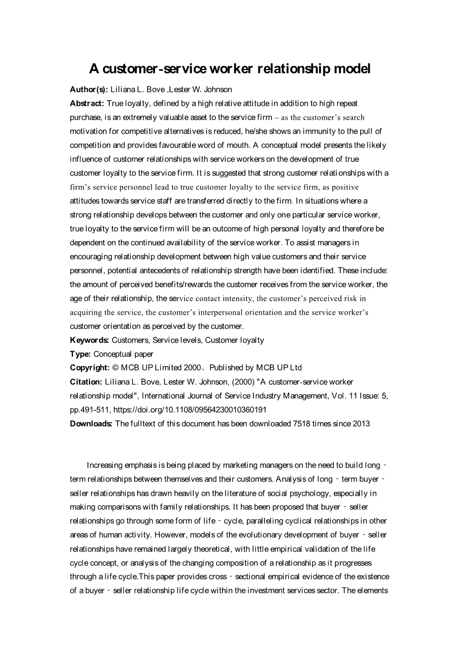引文:Liliana L. Bove, Lester W. Johnson, (2000)“客户服务人员关系模型”,《国际服务行业管理杂志》,第11期:第5期,第491-511页,https://doi.org/10.1108/09564230010360191。