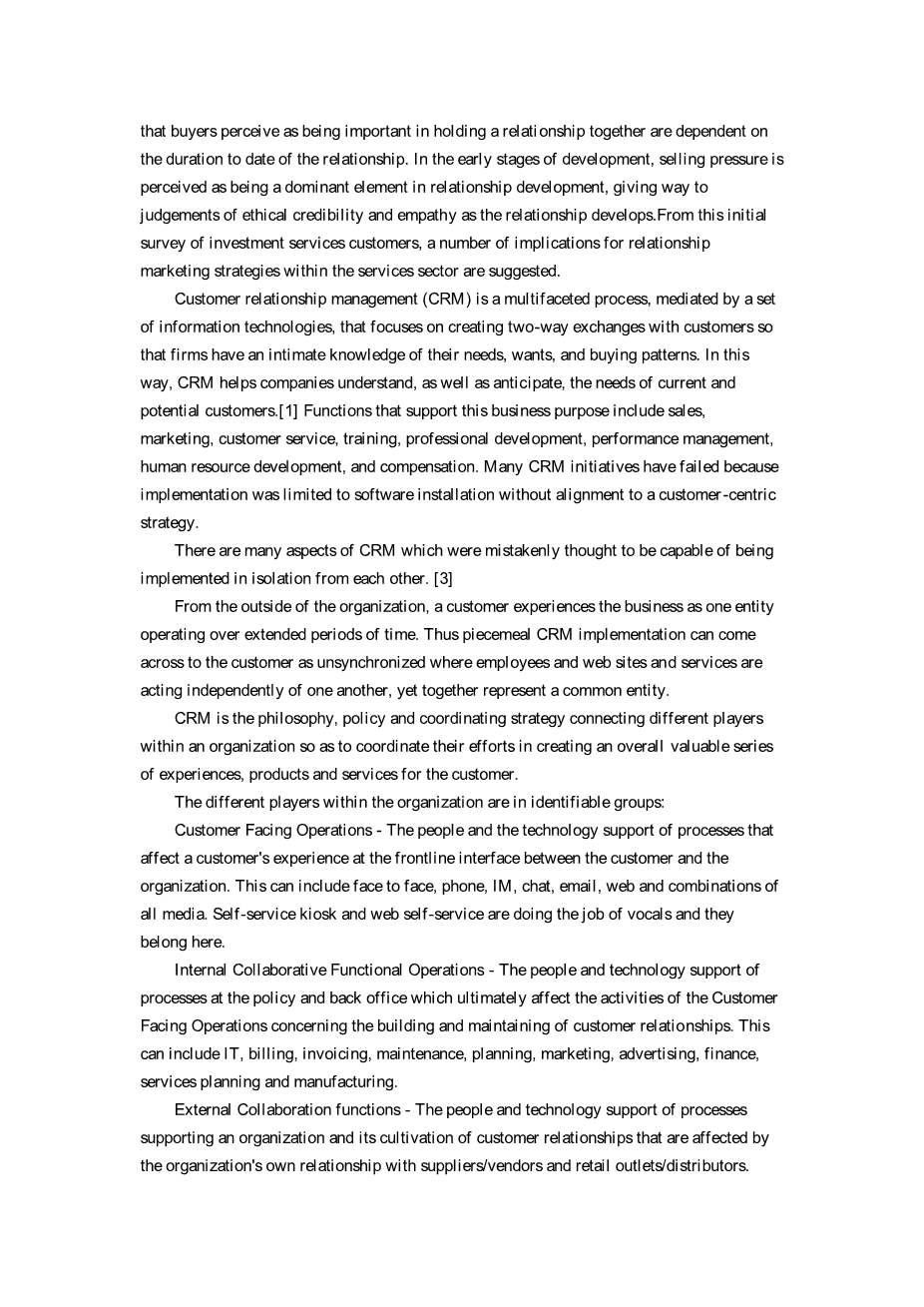 营销者越来越强调,他们需要在自己和客户之间建立长期的关系。摘要长期买卖关系的分析在社会心理学的文献中得到了很大的借鉴,尤其是与家庭关系的比较。有人提出,买方和卖家之间的关系经历了某种形式的生命周期,与人类活动的其他领域的周期性关系进行了平行循环。然而,买方与卖方之间的关系的演变模型基本上仍然是理论性的,对生命周期概念的经验验证很少,或者随着其在整个生命周期中进行的变化的组成的分析。本文提供了在投资服务部门中存在买方和卖方关系生命周期的交叉部分经验证据。购买者认为在维系一段关系中重要的因素是关系的持续时间。在发展的早期阶段,销售压力被认为是关系发展的主导因素,在关系发展的过程中,人们会对道德的可信性和同理心做出判断。从对服务客户的初步调查中,可以看出服务行业内的关系营销策略的一些影响。