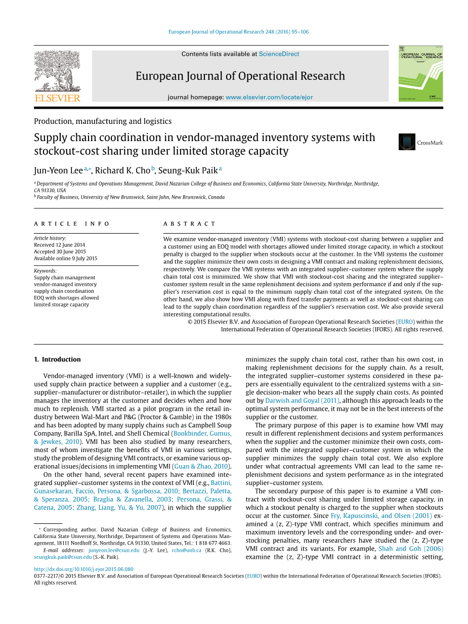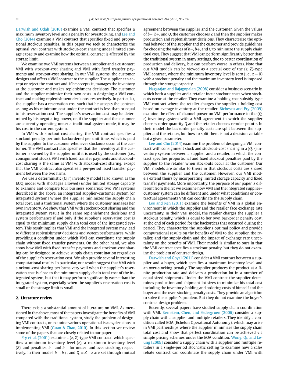 Lee和Cho(2014)研究了供应商和零售商在(Q,r)库存系统中设计寄售库存和缺货成本分担的VMI合同的问题,在该合同中,规定了当客户缺货时供应商向零售商支付的成比例和固定缺货罚款。我们的VMI模型与他们的类似之处在于,缺货成本由供应商和客户共同承担。然而,我们的VMI模型通过包含有限的存储容量和固定的转移支付来扩展它们。更重要的是,本文的目的与他们的不同:我们研究了VMI和集成的供应商-客户系统是如何不同的,以及VMI在什么条件或合同协议下能够协调供应链。